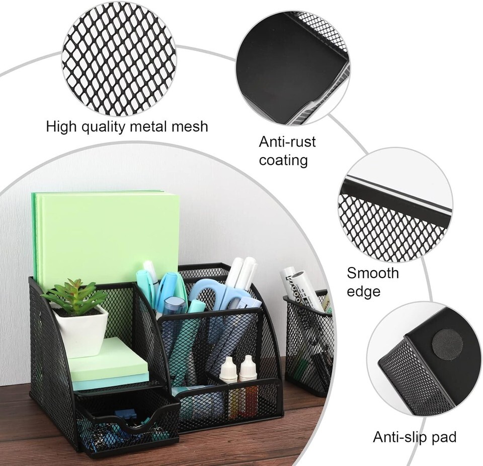 Sustained Material: The metal mesh desk organizer is made of high quality metal mesh with anti-rust coating added, the bottom is weighted and the anti-slip pad is added to keep your desk organizer neat and without any scratches, so this desk organizer and accessories is also a stylish gift.