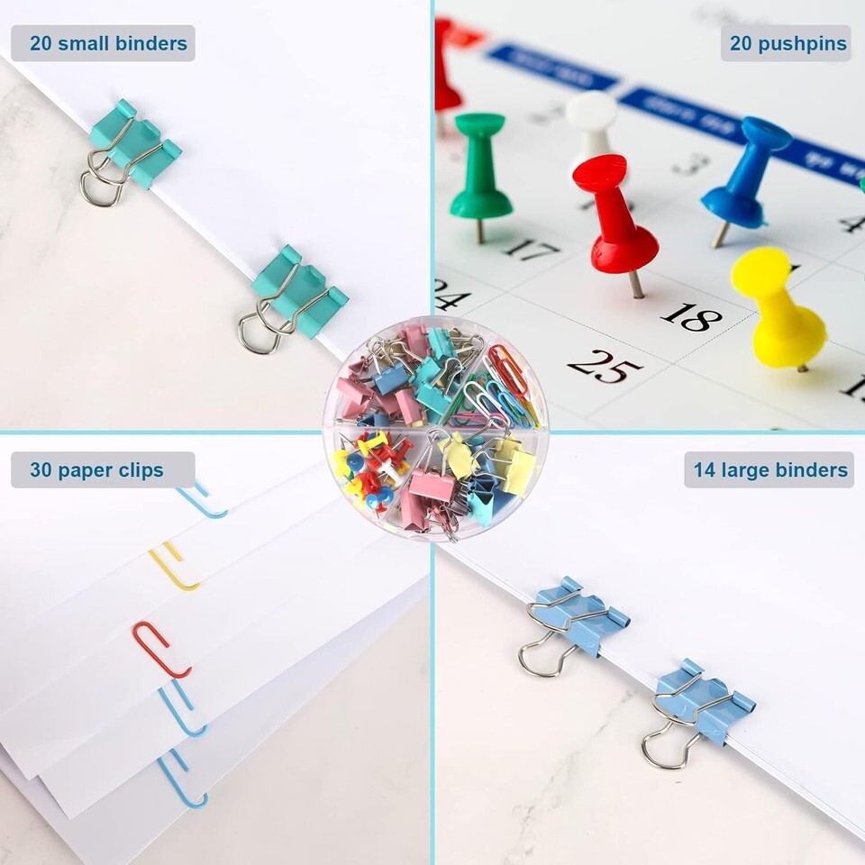 Multifunctional Desk Organizers and Accessories Set: Desk Organizer has 6 compartments with drawers, 1 square pen holder and 84 colorful desk accessories (14 large binders + 20 small binders + 20 pushpins + 30 paper clips).