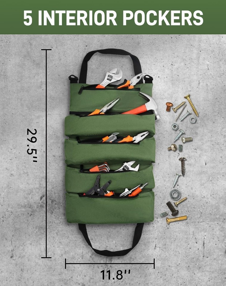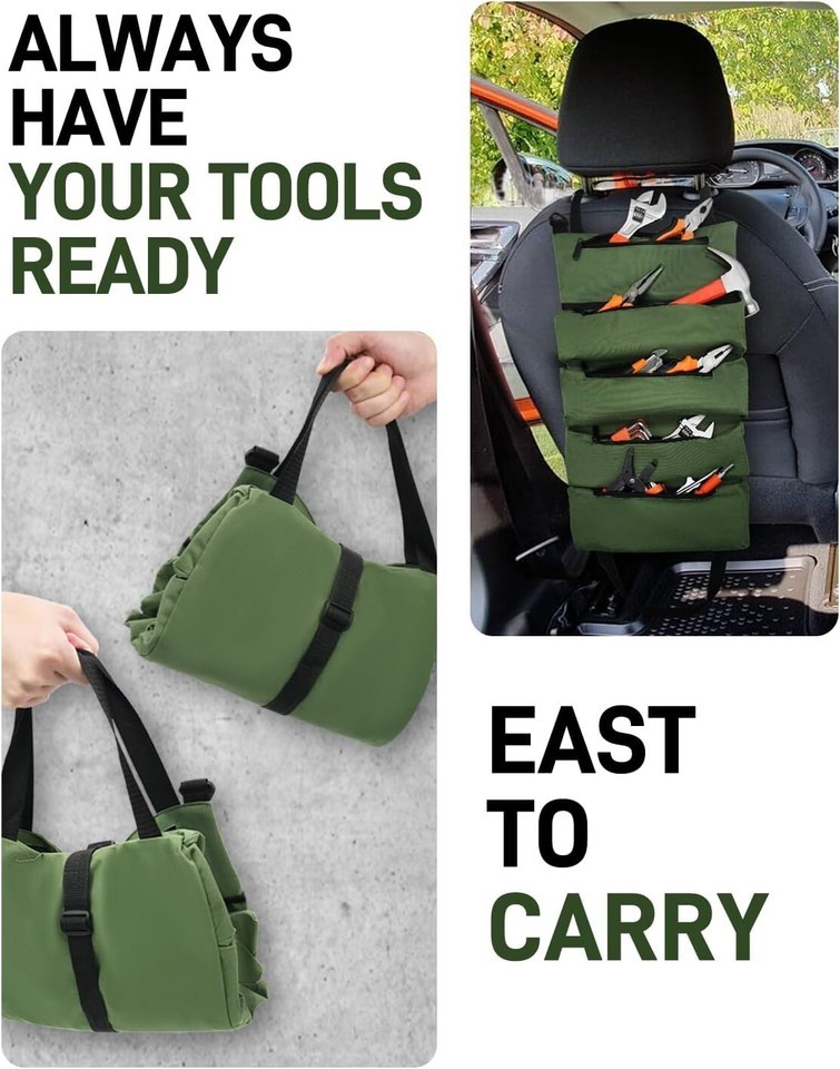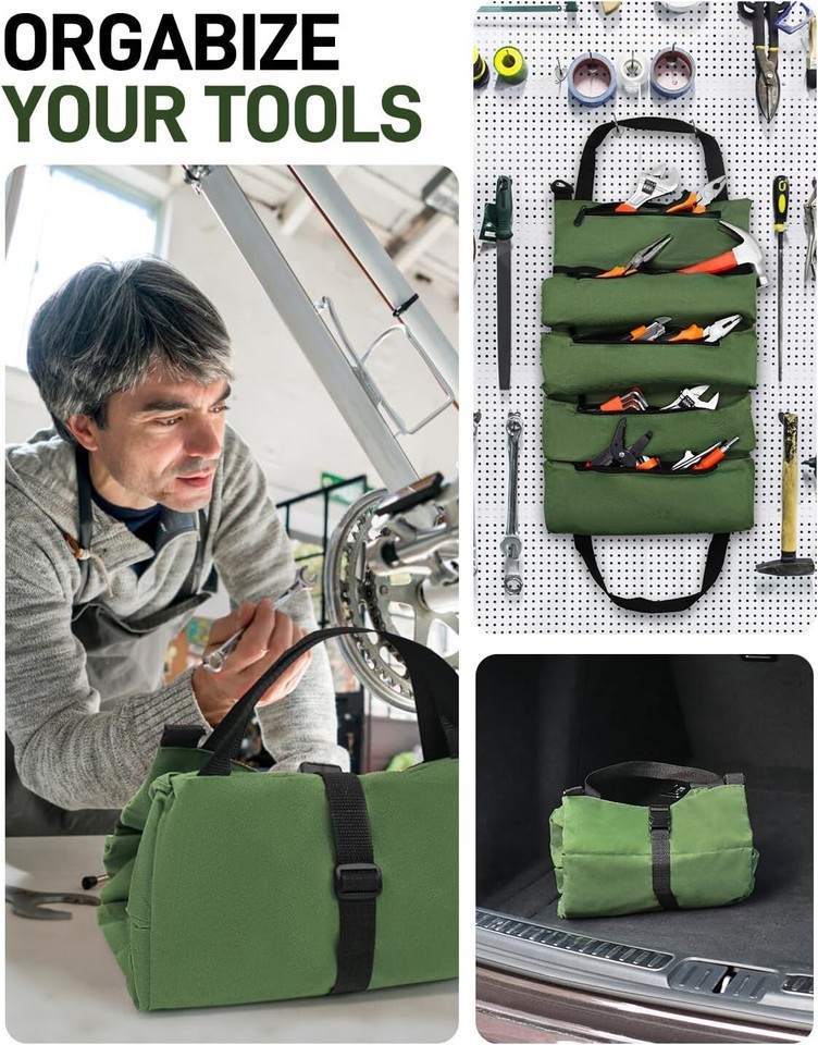 ?Upgraded Tool Roll Up Bag?The tool roll organizer is a must-have for mechanics, framers, plumbers, electricians, carpenters and hobbyists. It can carry not only a variety of screwdrivers/wrenches, bicycle or motorcycle tools, repair kits, electrician tools, car or truck trailer kits, but also gardening tools, BBQ sets, painting tools, etc. Never a problem as an emergency kit for home use, car camping trips or yachting.