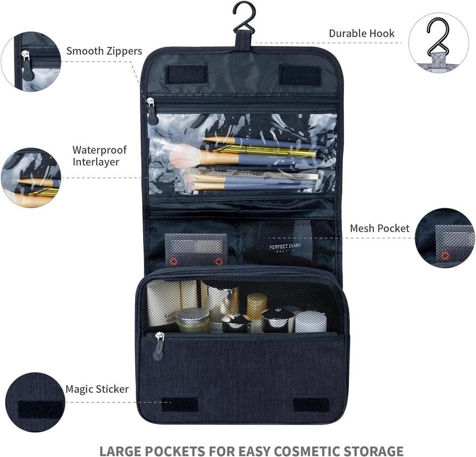 High QUALITY FABRIC: The toiletry bag is made of newly upgraded cationic 300D fabric, the surface is waterproof, wear-resistant, durable and practical. The toiletry bag can be hung on towel racks, coat racks and anywhere else available to save much space