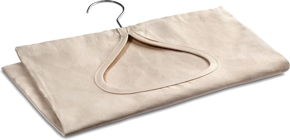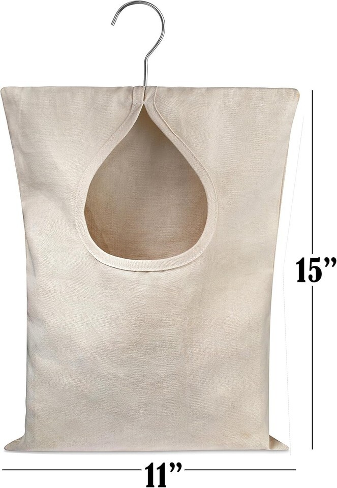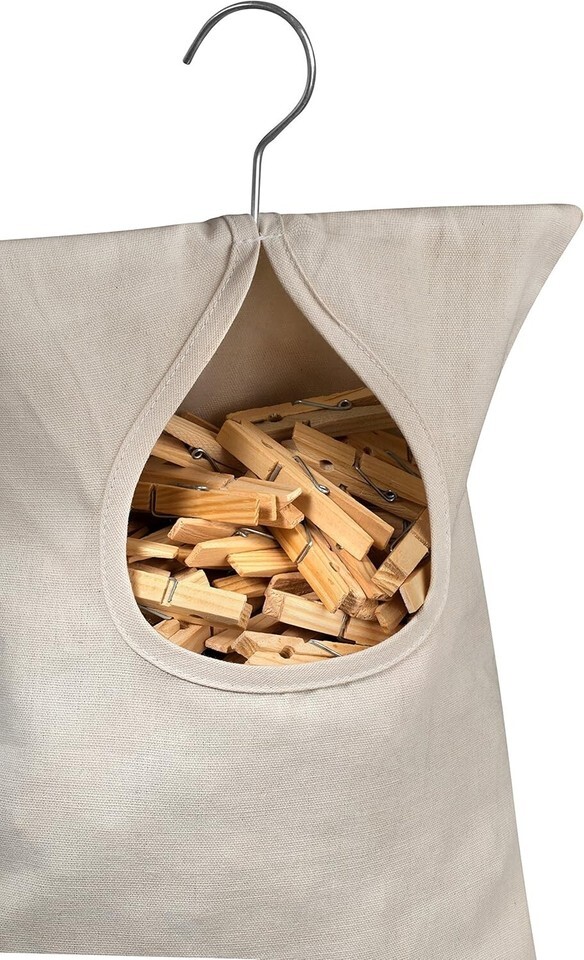 Washable clothespin bag with a large opening for easy access holds 100 medium-sized clothespins.
