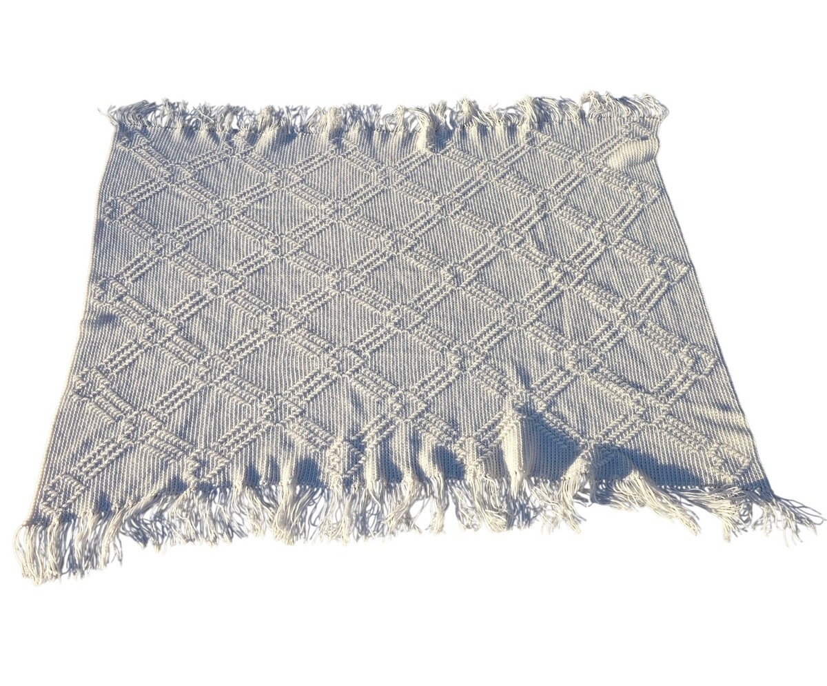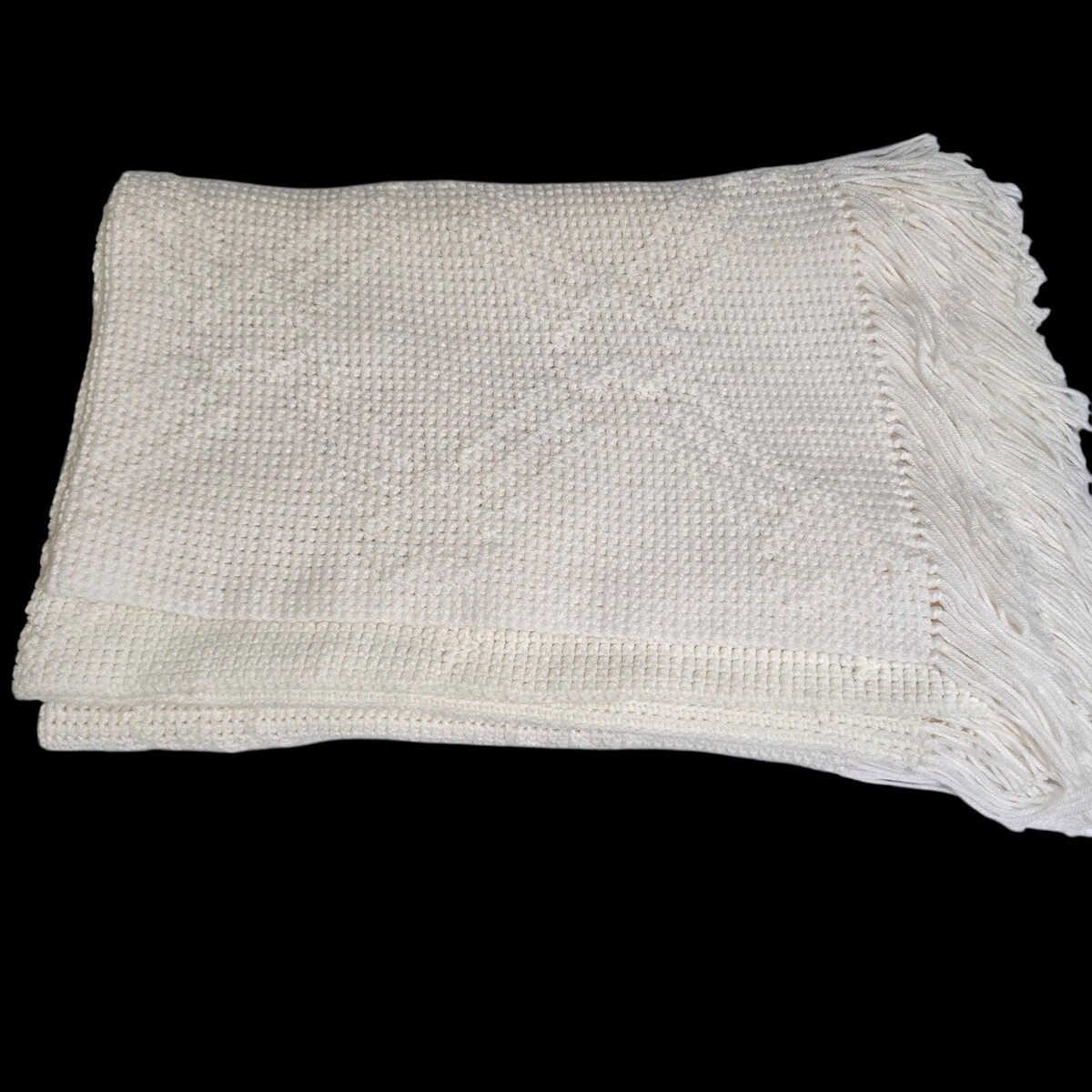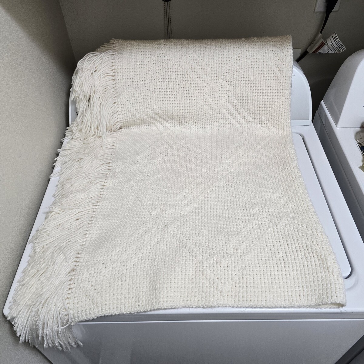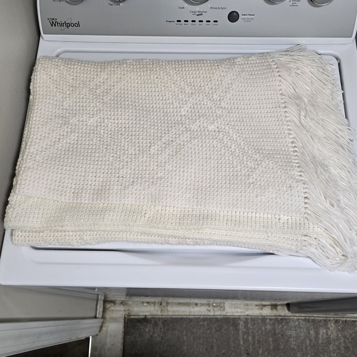 VTG Boho Farmhouse Handwoven Cotton Throw Blanket Diamond Fringe Ivory 42x50