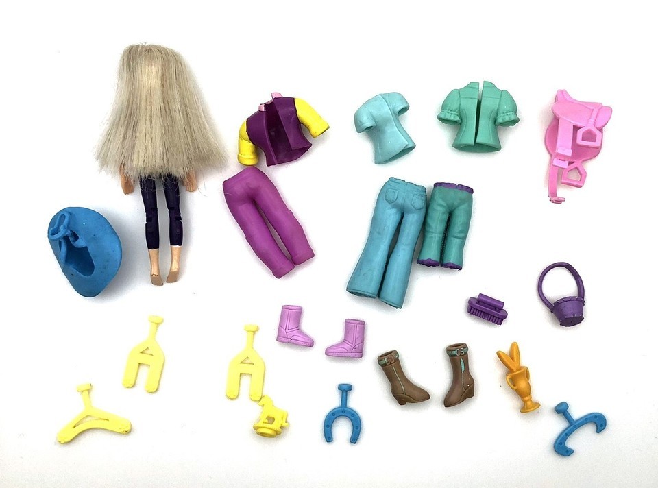 Polly Pocket Doll With Clothing, Shoes Accessories. The doll comes with everything shown in the pictures. The clothing is made with a rubber material. The dolls are around 3 oe inches tall. The dolls and clothing are in good, pre-owned condition and do show minor wear from play. I do have more Polly Pocket dolls and mini dolls at my shop and offer combined shipping in cart when you purchase multiple items from my shop.
