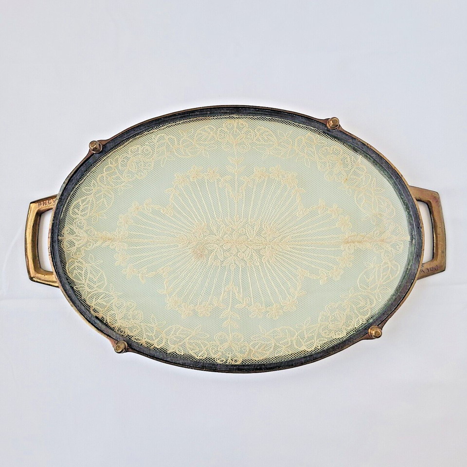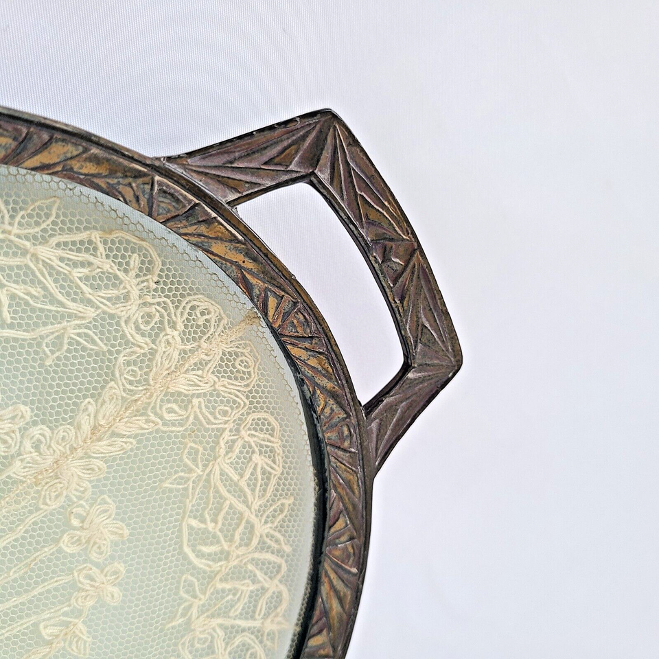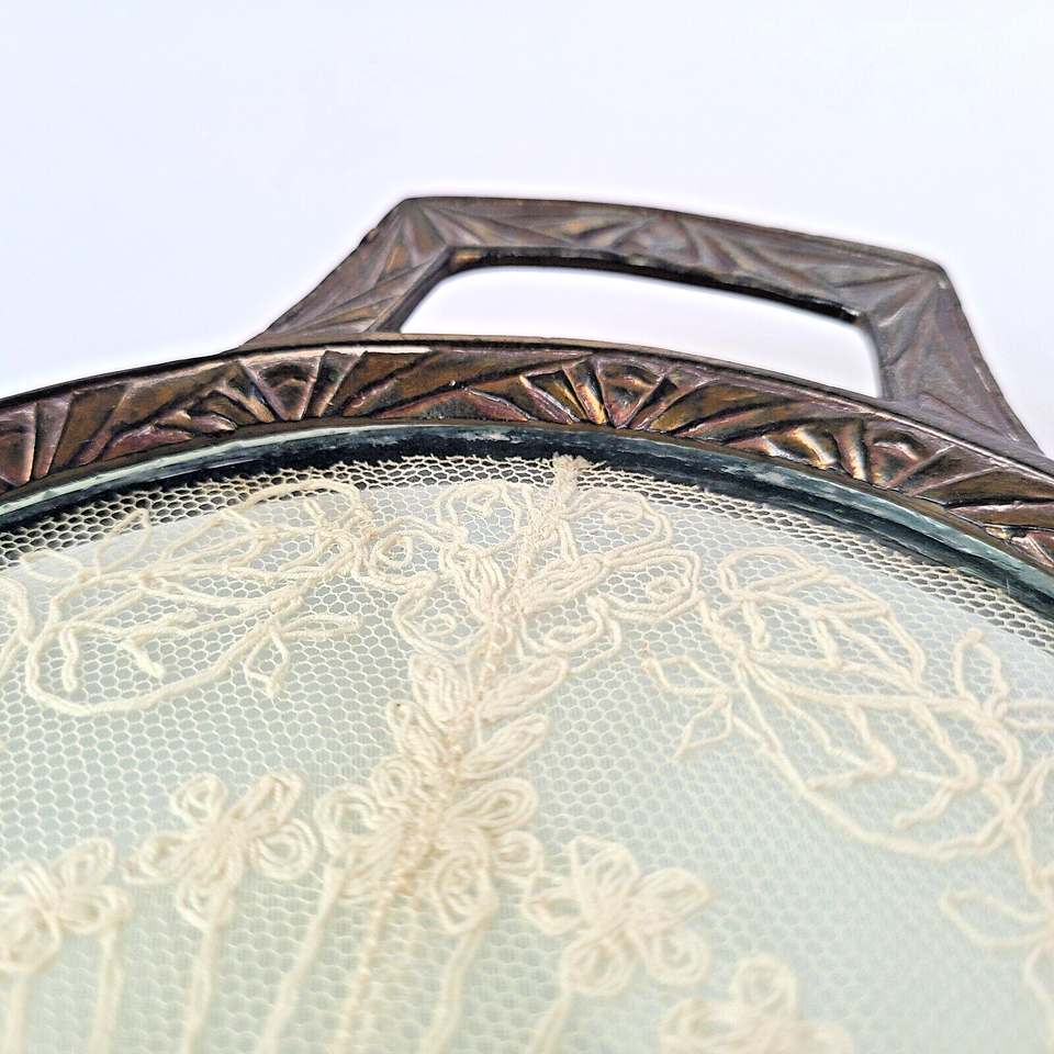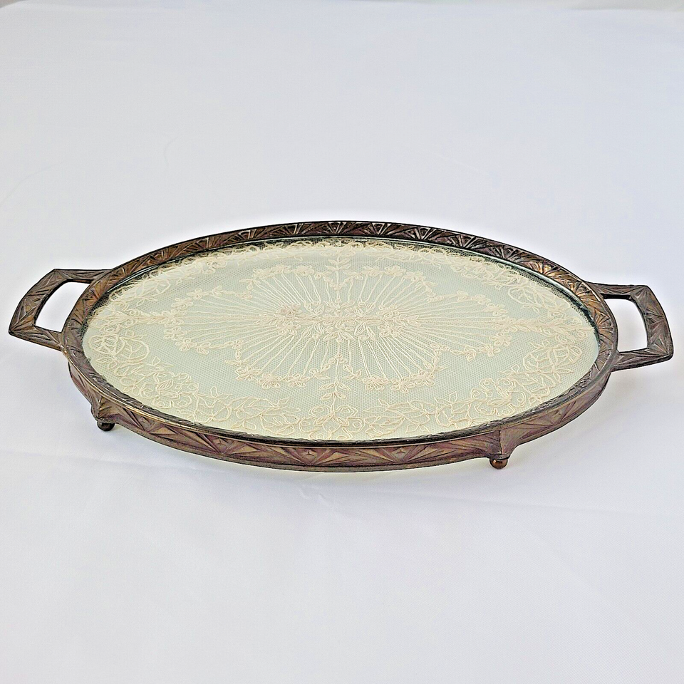 1920s Art Deco Vanity Perfume Dresser Glass Over Antique Lace Footed Tray Ornate