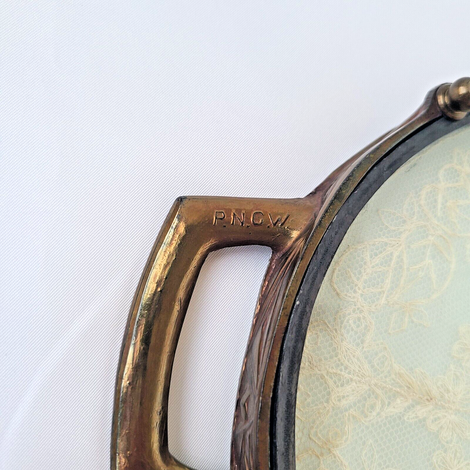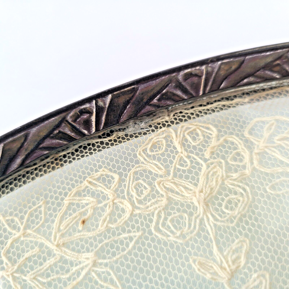 The glass portion of the tray is a smidge loose, but remains secured. There are a few chips in the glass, however, they are only on the edges and are under the metal rim so they are not hazardous. There is some yellowing to the lace due to the age of the piece. Please view all photos provided! All flaws are photographed.