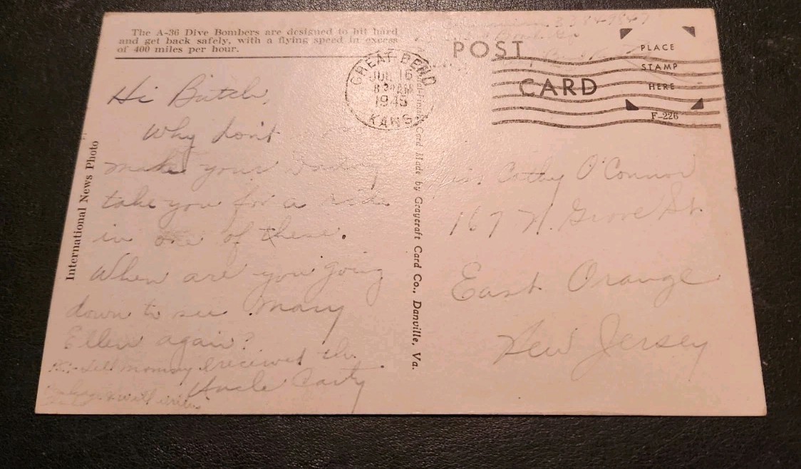 The product is a collectible postcard featuring a flight formation of US Army A-36 Dive Bombers postmarked 1945. The postcard was mailed from Great Bend, Kansas to East Orange, New Jersey, showcasing the historic military aircraft in a dramatic and patriotic composition. This historical piece captures a significant moment in American military aviation history and would be a prized addition to any postcard or aviation memorabilia collection.