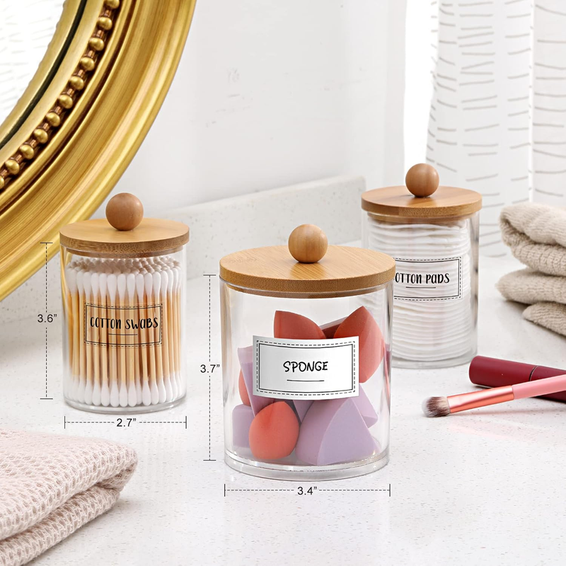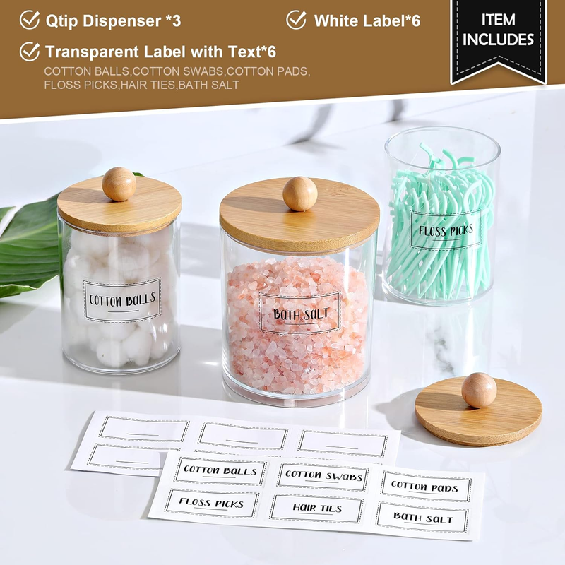 3 Pack Qtip Holder Dispenser with Bamboo Lids 12 Labels