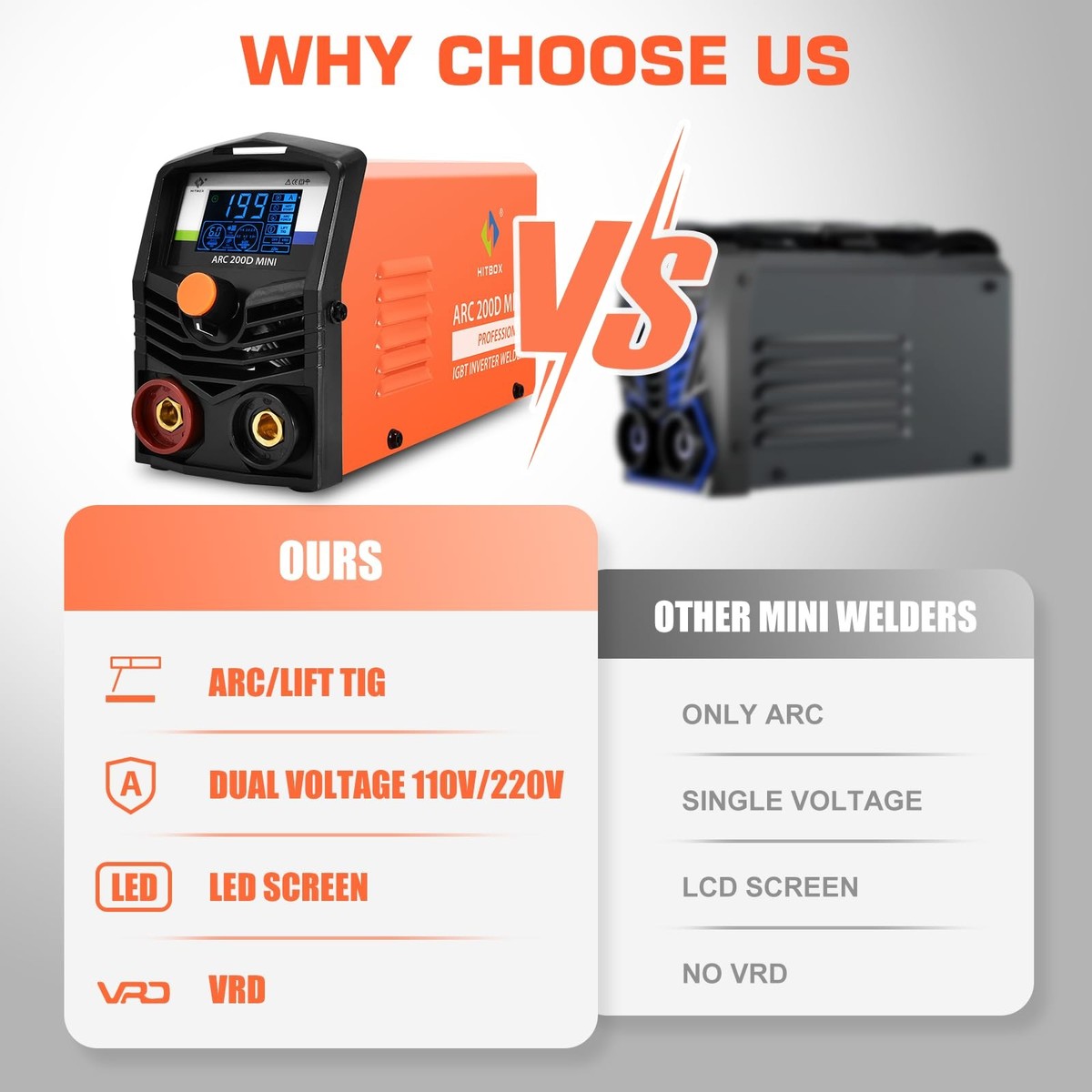 ?Hot Start And Arc Force?This small inverter welder automatically matches 110V and 220V. 1/8'' welding rod could be ignited by turning on hot start and arc force. 10-165A at 110V, 10-200A at 220V.