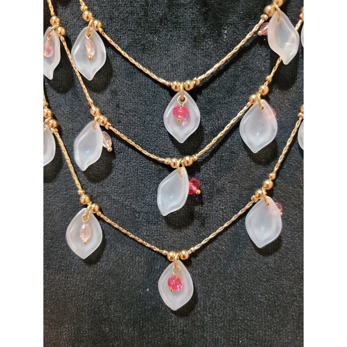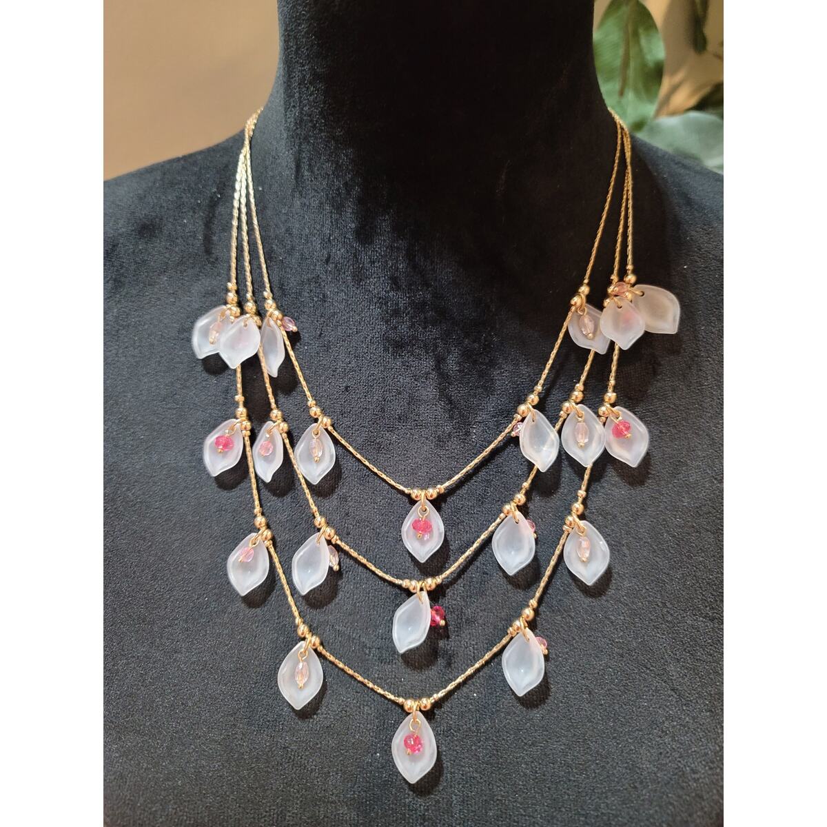 Women's Layered Gold Chain Necklace With Frosted Petal Charms And Pink Beads
