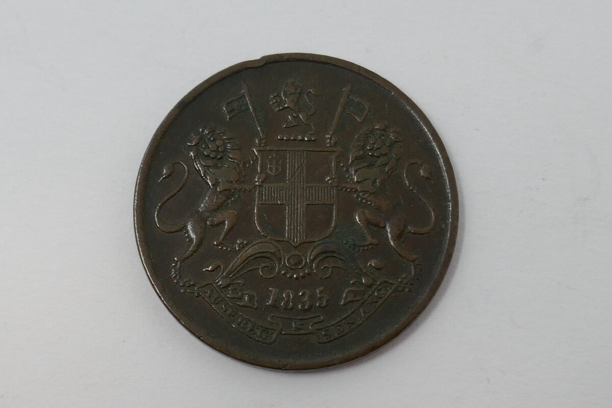 This is a 1835 East India Company OE Anna copper coin from India. This historical coin was minted during the British rule in India and is a part of the Asian numismatic collection. The coin is composed of copper and features the iconic East India Company seal on one side, reflecting the company's influence and power during that time period. This coin is a valuable piece of history that showcases the political and economic dynamics of India during the 19th century.