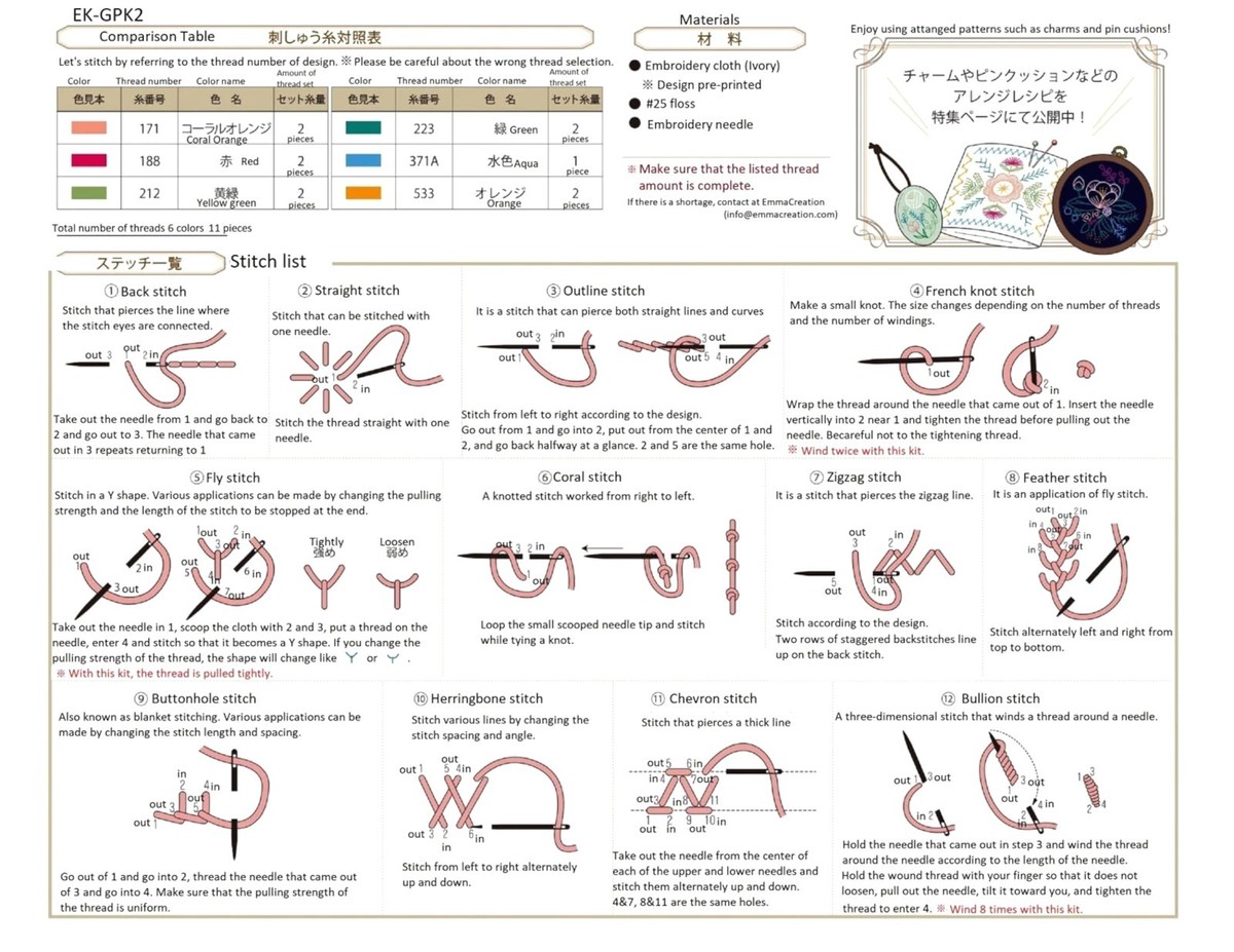 It contains 100 percent. cotton embroidery cloth in 13cm x 26cm with pre-printed patterns for practice, six colors of Cotton No 25 Embroidery floss, needle and instructions.