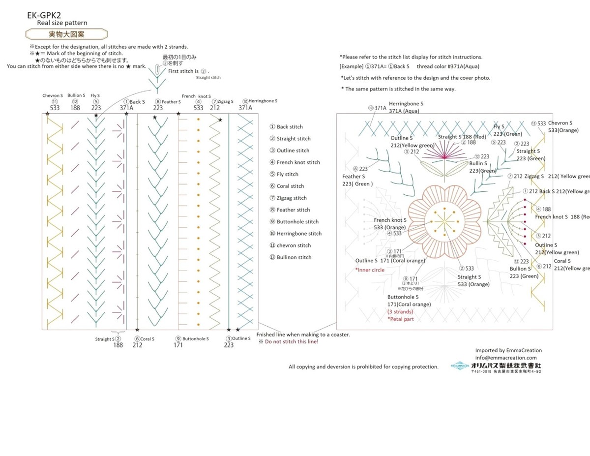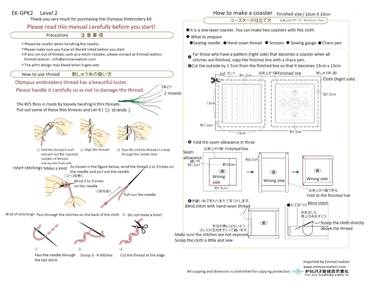 Olympus Garden Party First French Embroidery Kit Level 2 GPK-2. This embroidery stitch learning kit level two teaches you 12 medium stitches. It contains 100 percent. cotton embroidery cloth in 13cm x 26cm with pre-printed patterns for practice, six colors of Cotton No 25 Embroidery floss, needle and instructions. Difficulty Level: Beginner. Estimated production time: 6 hours. Fabric Size (H x W): Approx. 5.1 x 10.2 inches (13 x 26 cm). Item Number: GPK-2. CHK-EK-GPK2
