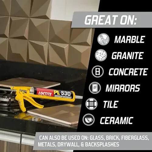 The Loctite PL 530 construction adhesive is used by professional installers, tile setters, and contractors securing heavy, high-value surfaces in kitchens, bathrooms, and commercial facilities. Ideal for mounting mirrors over vanities, attaching granite countertops to cabinets, securing marble backsplashes, and bonding tile to drywall or concrete substrates ? it delivers a clean, invisible bond that outperforms mechanical fasteners in aesthetics and durability. Its moisture-resistant formulation makes it the preferred choice for steamy bathrooms and wet areas where conventional adhesives fail. Professionals rely on its reliability, low odor, and compliance with environmental standards to ensure lasting installations ? delivering the quiet confidence that every bonded surface remains secure, stain-free, and structurally sound for the life of the project.