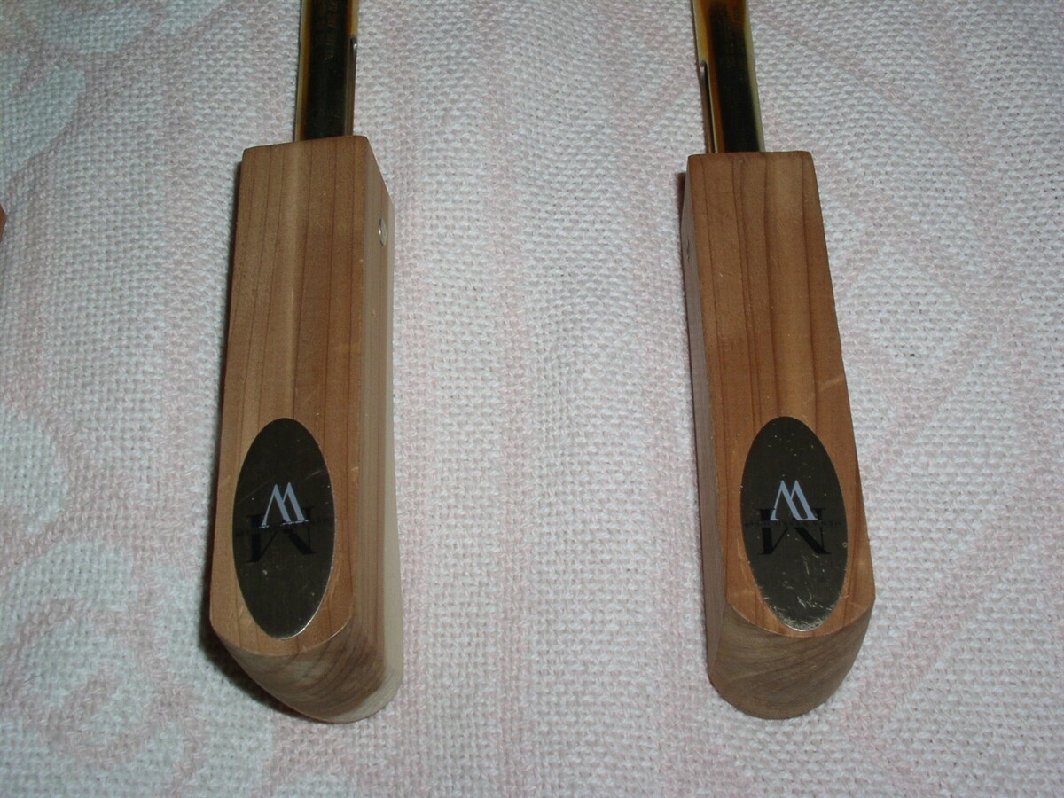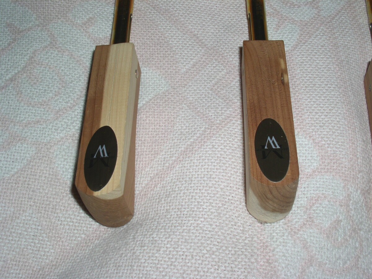 This is a set of 4, men's wooden cedar shoe tree stretchers from Men's Wearhouse. Manufactured by Rochester Shoe Tree Co., Ashland NH. These can be used as a shoe tree to maintain the shape of the shoe or also can be used as a shoe stretcher. They aren't marked but they look size Large.