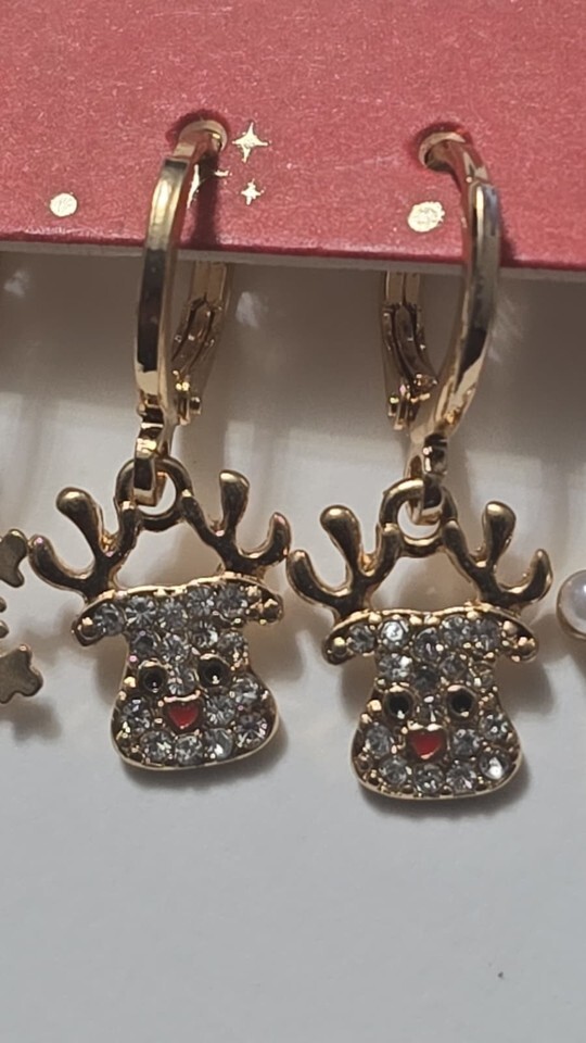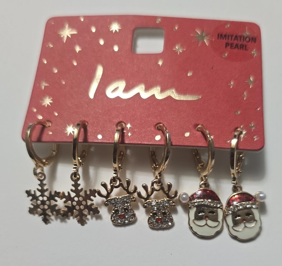 The product is a set of three pairs of limited edition Christmas earrings in gold,