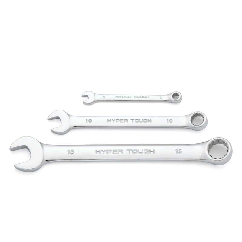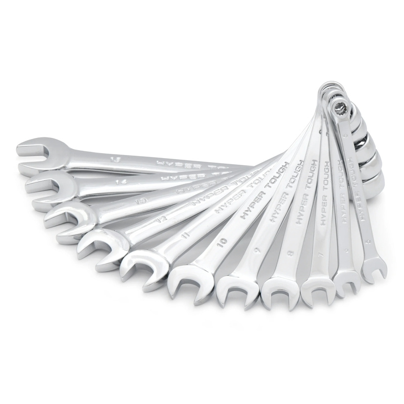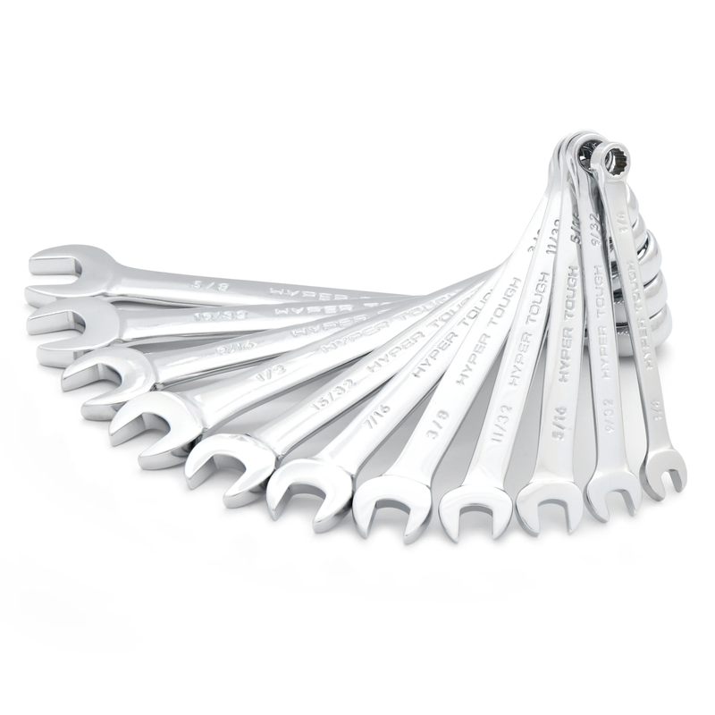 Hyper Tough 22 Piece Combination Wrench Set, Metric and SAE Chrome Vanadium Steel Mirror Polished Heat Treated Precision Machined Nickel Chrome Plated Sizes: 5, 6, 7, 8, 9, 10, 11, 12, 13, 14, 15 MM 1/4, 9/32, 5/16, 11/32, 3/8, 7/16, 15/32, 1/2, 9/16, 19/32, 5/8 Meets ASME standards