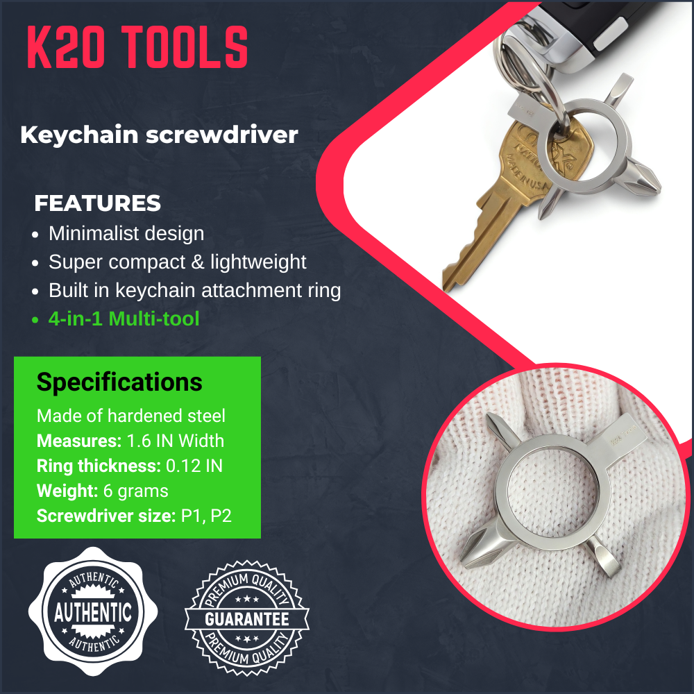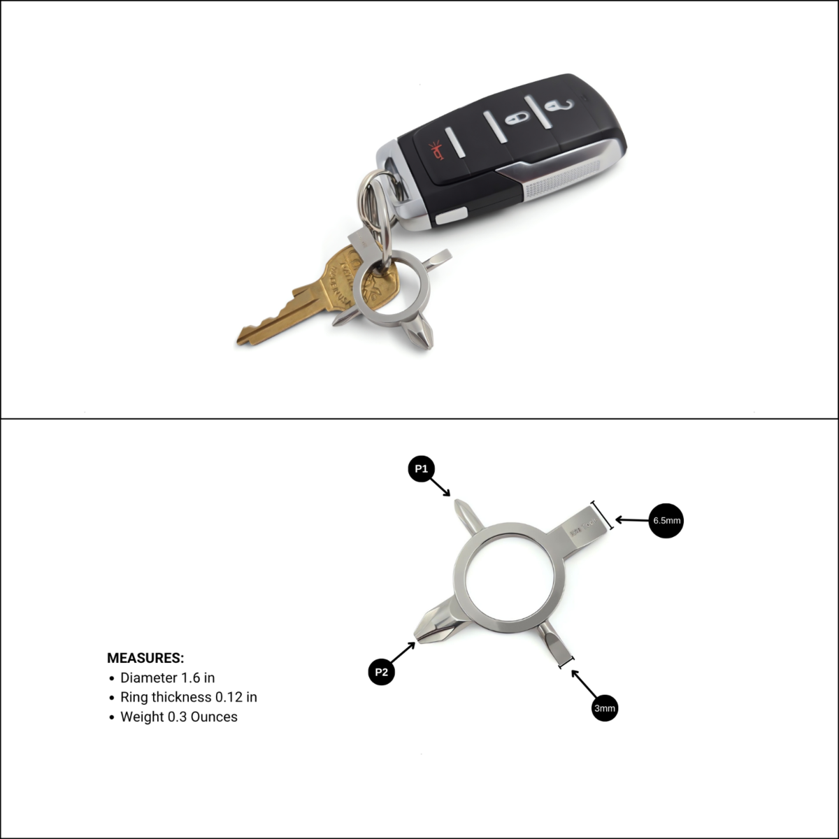 A small multi-tool with 4 different sizes in one piece ( Phillips and Flat Head ). Super compact and portable design, making it convenient for everyday carry. This tiny screwdriver is commonly designed to be lightweight and small enough to attach to your keyring and fit easily in your pocket.