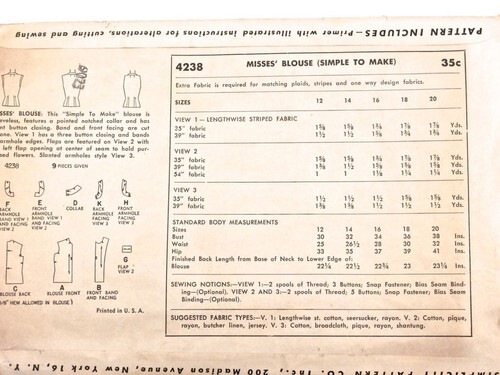 Vintage 1950s Sewing Pattern Simplicity #4238 Blouse Simple Size 12 Bust 30
