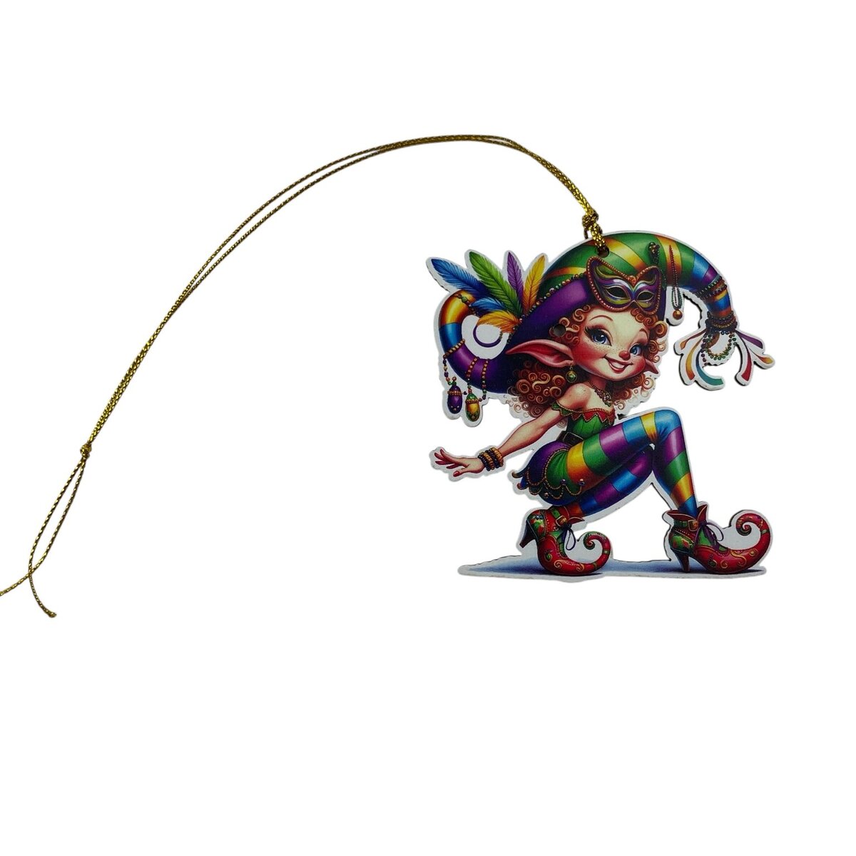 Celebrate the festive spirit of Mardi Gras with this vibrant wooden ornament featuring an adorable elf character. The ornament showcases a lively elf dressed in a colorful jester hat adorned with feathers and beads, striped leggings, and curled-toe shoes. The detailed design captures the playful essence of Mardi Gras with rich purples, greens, yellows, and blues, making it a perfect addition to your holiday decor or Mardi Gras celebrations.