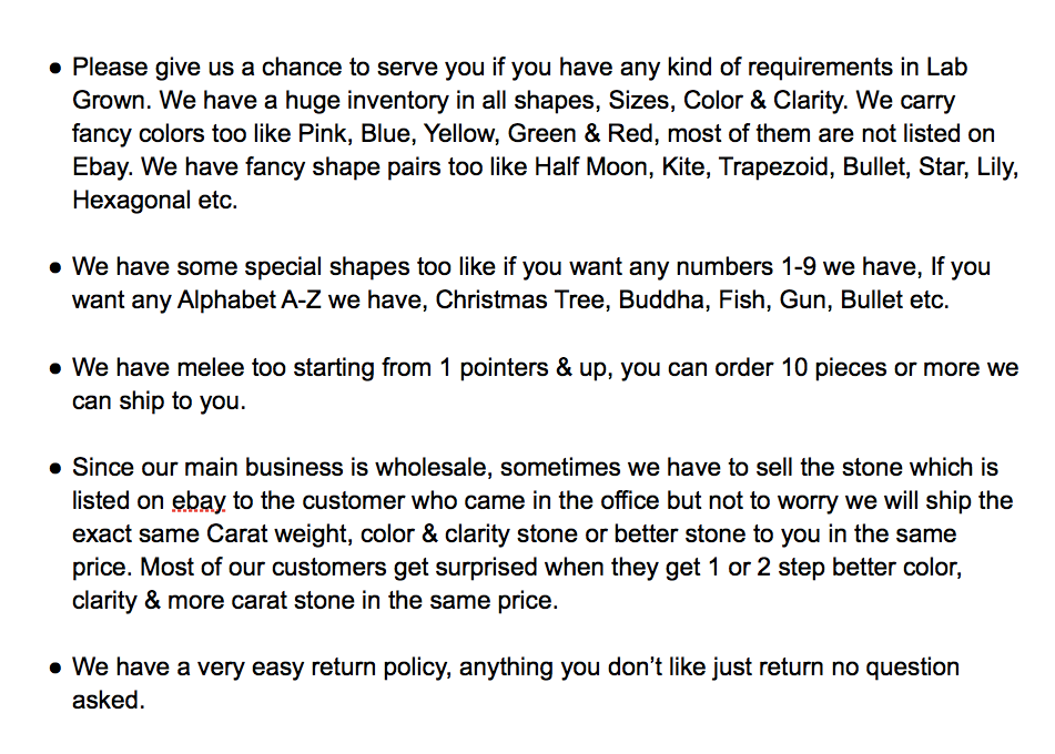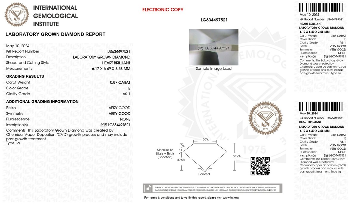 Terms Conditions:Kindly keep this in mind before making your purchase that we are selling our Lab grown diamonds on multiple platforms. The Diamond you receive will be exact color, clarity and cut. The only difference could be the IGI certificate which might differ from the listed stone. We highly appreciate your cooperation. LabIGIReport #-ShapeHeartCarat0.97ColorEClarityVS1Cut-PolishExcellentSymExcellentFluorNoneLocationSuratDepth56.5%Table65%GirdleSTK to THKCrown11.0%, 34.9Pavillion42.0%, 39.4CuletNoneMeas6.14 x 6.94 x 3.92Ratio0.88BGMNoneGrowth TypeCVDPlease note that we are listing all of our stone's color clarity grade as per IGI Lab Report. IGI Lab is the 2nd most reputable trustworthy Lab after GIA. Every person can have a different opinion about the color clarity of the stone. So the stones you are getting can be e to g in color vs1 to si1 in clarity grades as per GIA standards but as IGI standards those are as mentioned in the listing. how practical it is to use $75000 (3 Carat E VS!) Natural Diamond stone standard for the same color clarity grade (3 Carat EVS1) Lab Grown Stone which you are getting for $750. My advice to you is whatever authenticity says please please get the stone if you do not like then I will accept the return without any question in the next 30 days of purchase. I don't want you to miss the great opportunity to buy those beautiful lab grown stones which are 100% the same chemical other properties wise as natural Diamonds at 1% of price compared to Natural Diamond.
