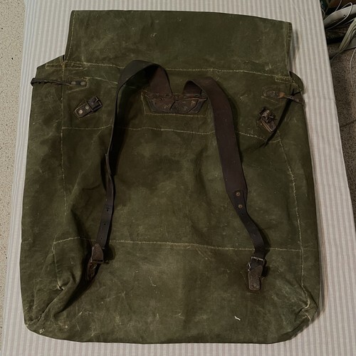 Canvas and leather, the canvas has some holes that could be patched. The leather seems decent for the age, but not sure it could still hold up for use.