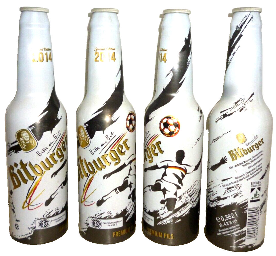 For sale is a wonderfull Set-of-17 Bitburger Beerglasses (15 - 2 Soccer WorldCup 1994 USA, 4 gold-rimmed stemmed, 4 limited-edition Sydney 2000 Olympics, 4 Soccer Teams Signature stemmed, 1 stemmed), Masskrug (1), Stein (1), EMPTY Soccer WorldCup 2014 Brazil Aluminum Bottles (4), 1 still-sealed Fan Scarf/Bandano, 1 promotion-only Musical CD, 1 un-used Model Truck 1 L/XL-sized textile T-Shirt from the Bitburger Simon brewery in Bitburg, Germany.