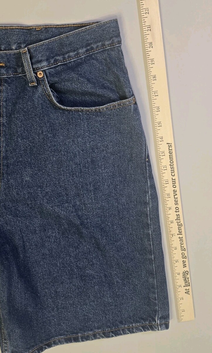 Labeled 38 measured 36. The Levi's 550 Vintage 2004 Men's Denim Jean Shorts are a classic and retro-inspired piece perfect for casual occasions. Made in Mexico, these shorts feature a zip closure, 5-pocket design with logo accents, and a 9-inch inseam. The denim fabric is a solid blue color, with a medium wash and regular fit. Perfect for all seasons, these shorts are a timeless addition to any wardrobe, representing the iconic Levi's brand and style.