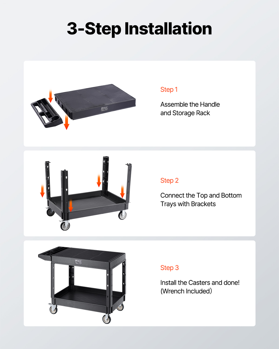 Quick Assembly, Wide Use: Assembly is simple, thanks to the easy-to-follow instructions. Set it up in minutes! Great for warehouses, garages, classrooms, or offices. Our service cart keeps your tools mobile and organized, saving you time and effort when moving or accessing equipment.