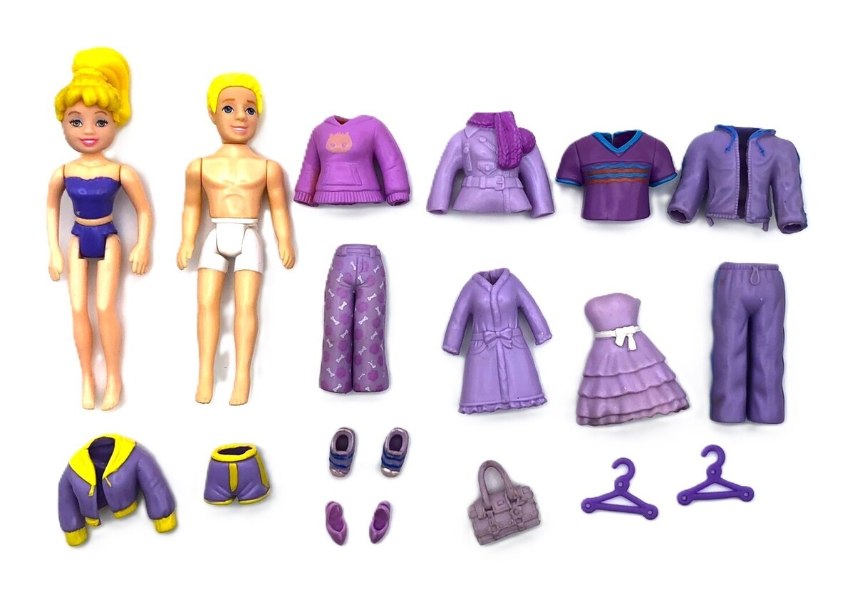 Polly Pocket Dolls Rick Polly Doll, Clothing, Shoes, and Accessories. The set comes with everything shown in the pictures. The clothing is made with a rubber material and the dolls are around 3 oe inches tall. The dolls and clothing are in good, pre-owned condition and do show a little wear from play. I do have more Polly Pocket dolls and mini dolls at my shop. Calculated shipping is applied to cart when you purchase multiple items at my shop.