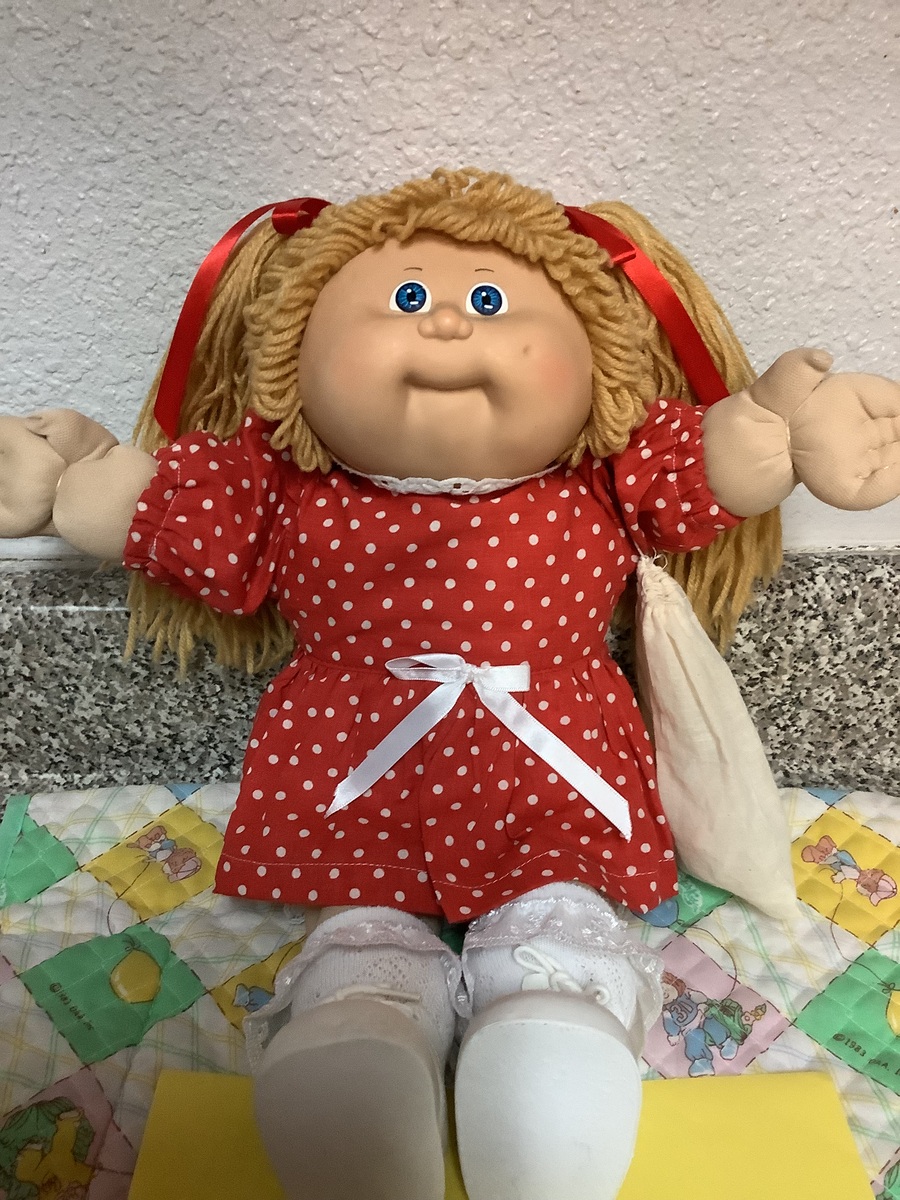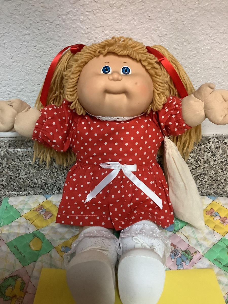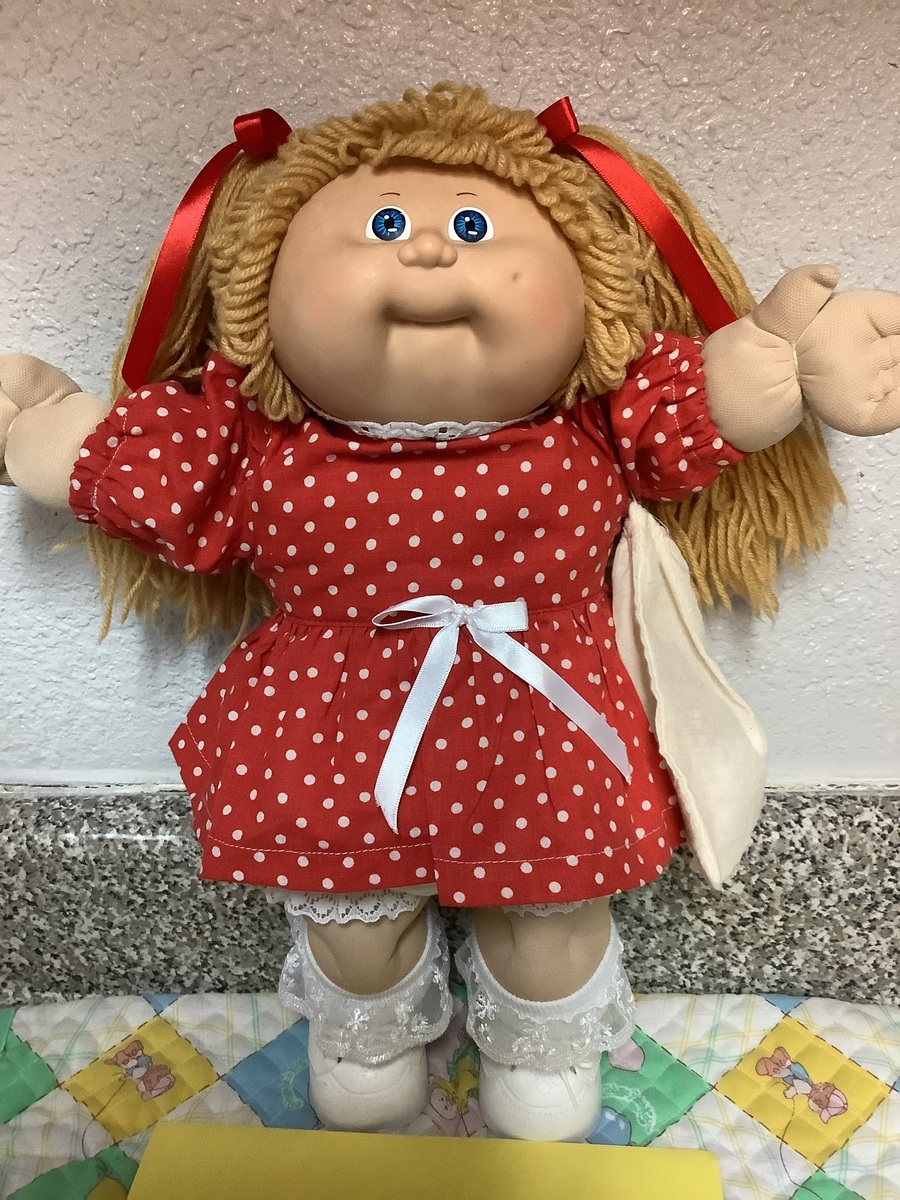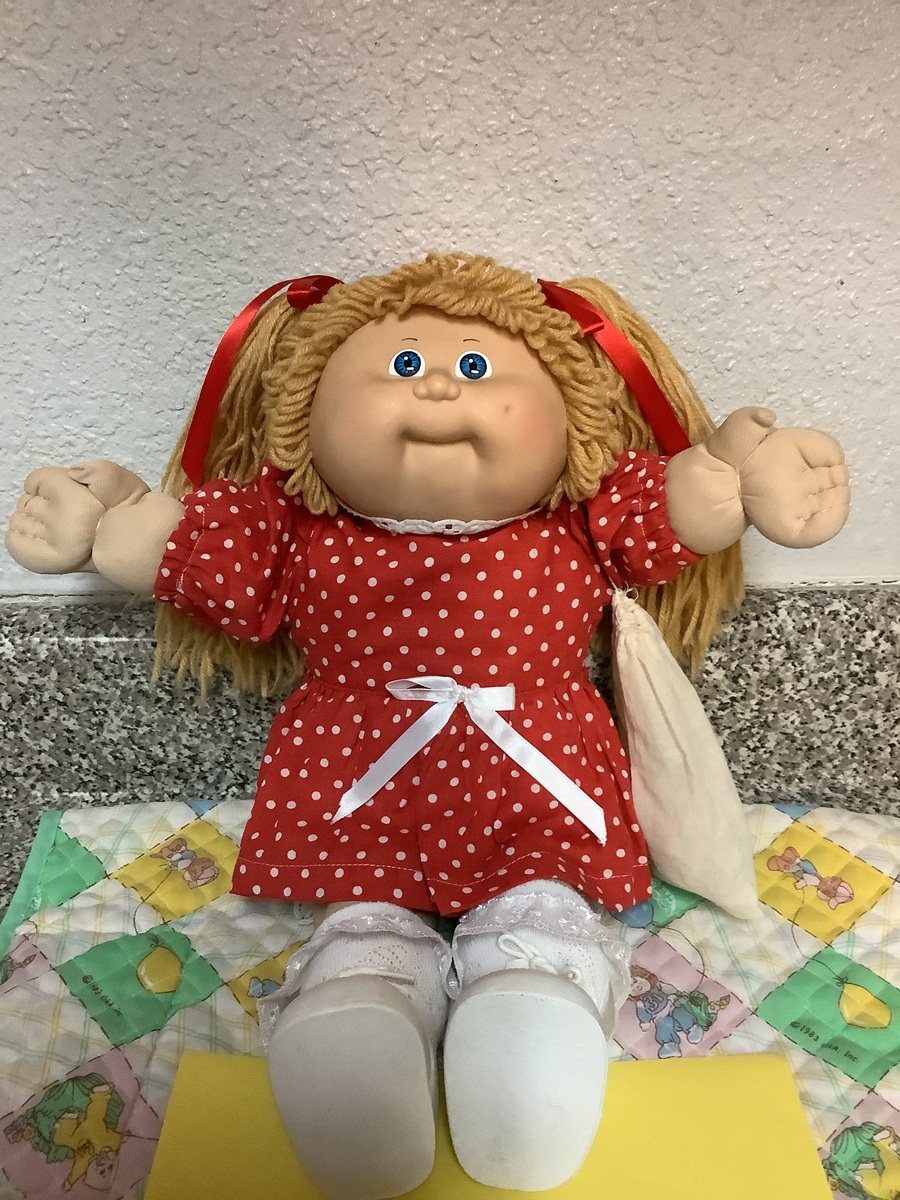 This little cutie has hard to find butterscotch double ponytails and pretty blue eyes. She is from the OK Factory and she has a blue 1985 signature. She is wearing a very pretty dress and pretty handmade bloomers. She is wearing a diaper, pretty lace socks, and CPK shoes. She is in very good vintage condition for her age of exactly 40-soon to be 41 but please bear in mind that she is still a vintage item-NOT NEW and therefore NOT PERFECT but definitely restored. Just look at her standing all by herself!! Please see all pics as they are part of the description. She comes from my smoke free home although I am not her original owner. Sold AS IS.
