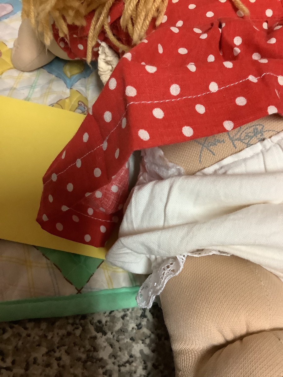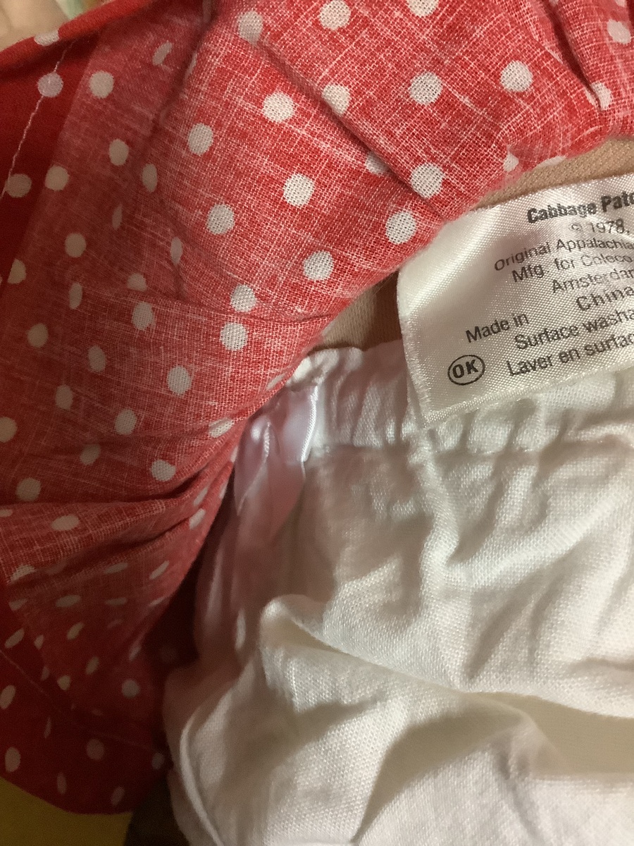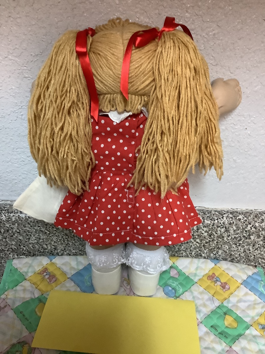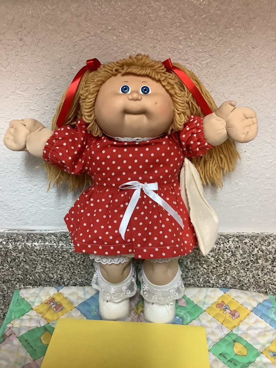 This little cutie has hard to find butterscotch double ponytails and pretty blue eyes. She is from the OK Factory and she has a blue 1985 signature. She is wearing a very pretty dress and pretty handmade bloomers. She is wearing a diaper, pretty lace socks, and CPK shoes. She is in very good vintage condition for her age of exactly 40-soon to be 41 but please bear in mind that she is still a vintage item-NOT NEW and therefore NOT PERFECT but definitely restored. Just look at her standing all by herself!! Please see all pics as they are part of the description. She comes from my smoke free home although I am not her original owner. Sold AS IS.