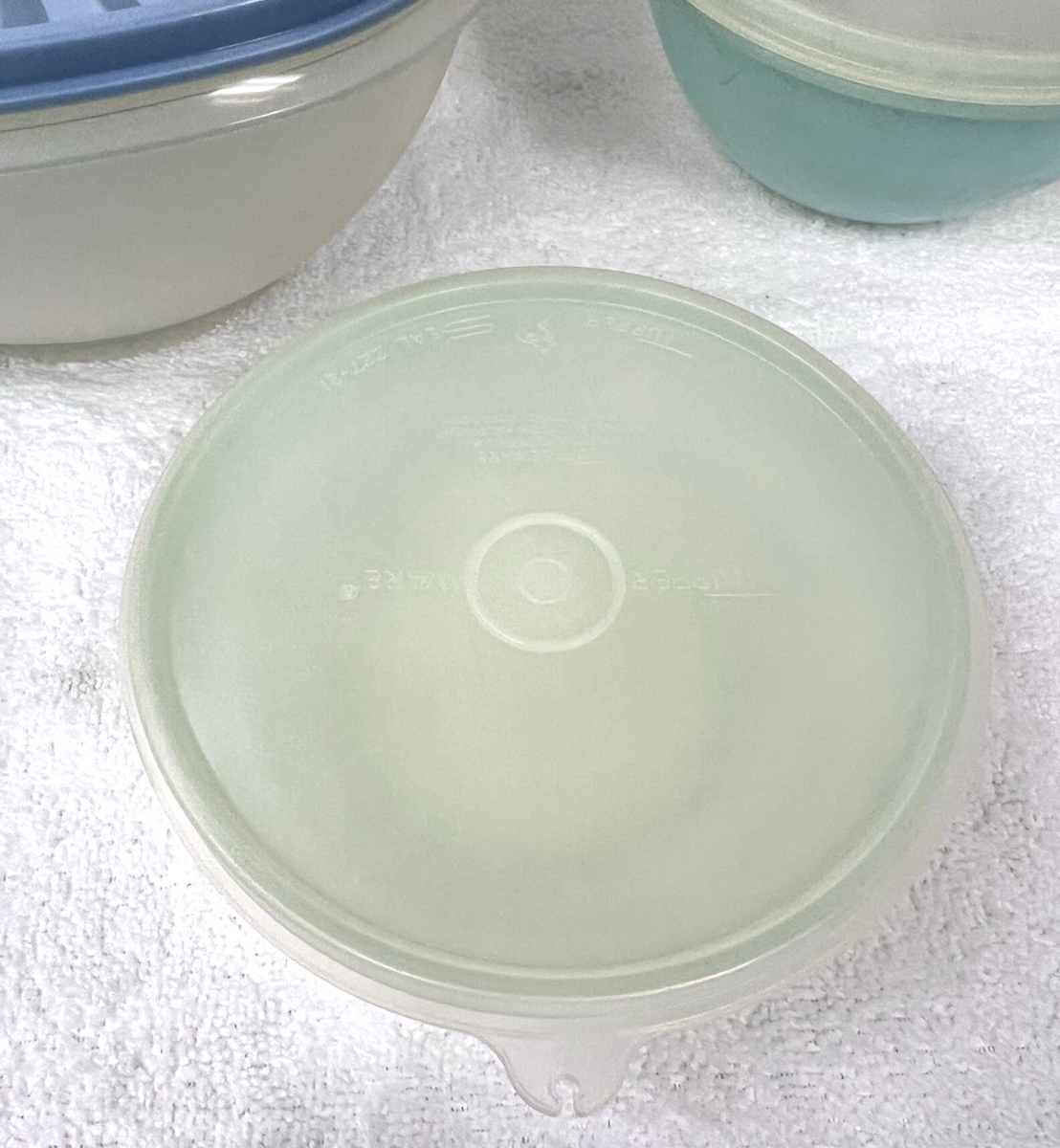 10 Piece Vintage Tupperware Pastel Colors Some Wear IN good shape all has been used so some light surface wear one lid has a t shaped mark pieces include numbers 107-7 234-8 233-9 155-39 858-5