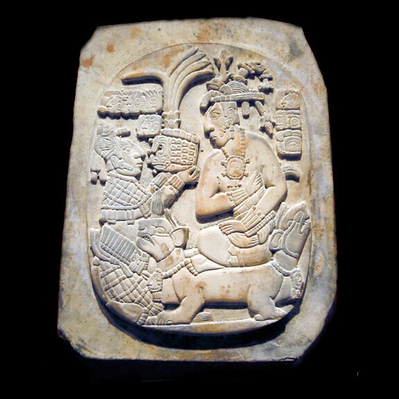 This ancient Mayan plaque depicts the Maya king in performing ritual rites.