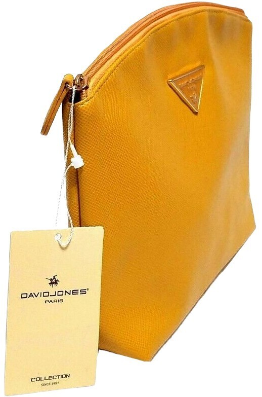 This item is a David Jones Paris Style DJ1594M Cosmetic Toiletry Bag in a mustard yellow color. The French brand is known for its fashion handbags made of high-quality faux leather materials.