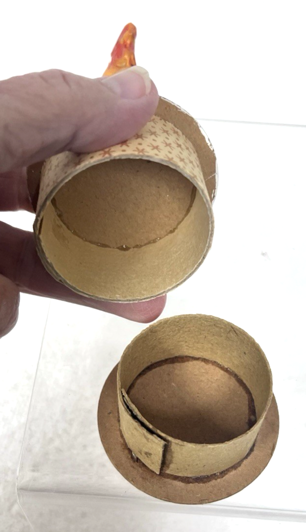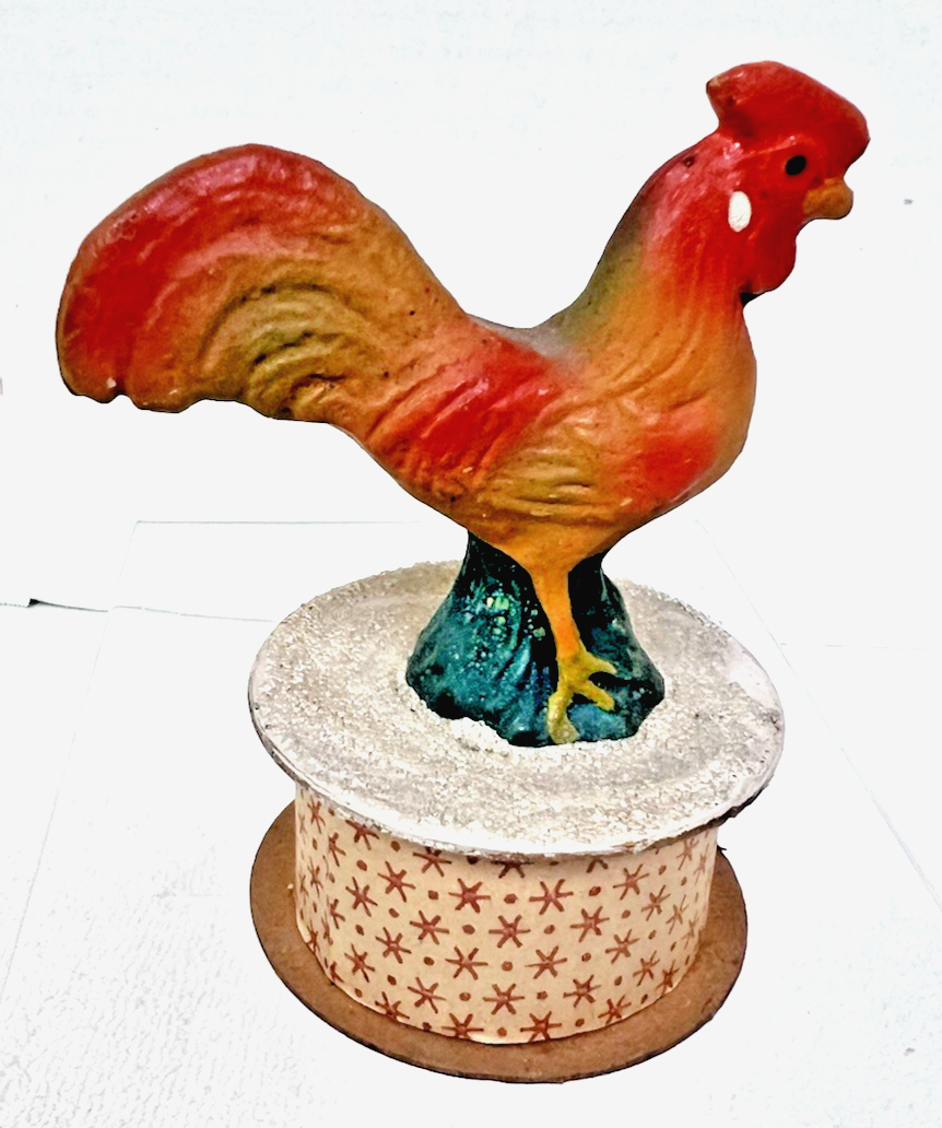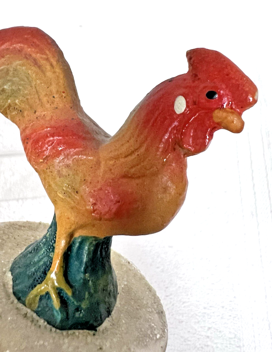Vintage German Chicken Rooster Spring Easter Candy Container Sugar Mica 3.5"T about 3 1/2 Tall the base is 2 1/8 inches the rooster/chicken is plaster the bird is sitting in a snow-mica topped paper box it is stamped Germany. There is some mica loss and the paper has finger-wear nothing bad the paint and rooster are in good shape