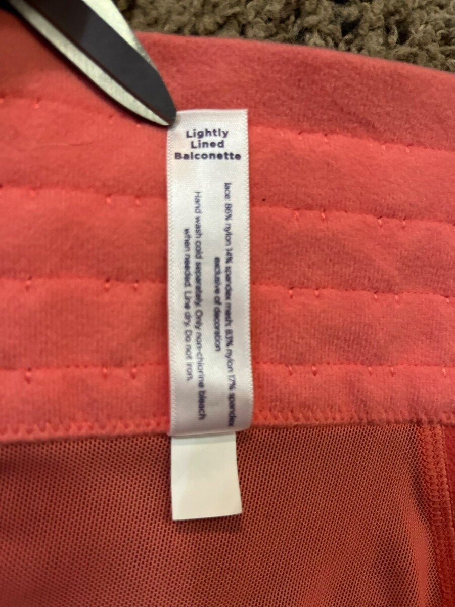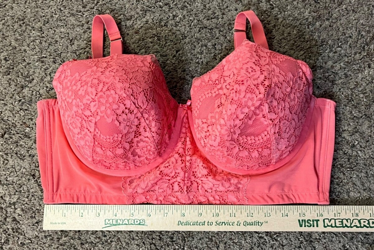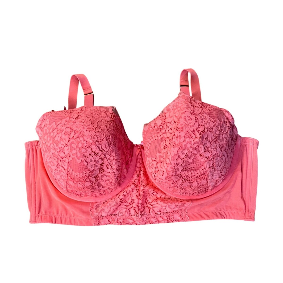 Cacique, 42DDD, balconette bra, lace bra, salmon pink, coral bra, plus size lingerie, underwire bra, lightly lined bra, longline bra, womens intimates, Lane Bryant Cacique, supportive bra, adjustable straps, gold hardware, nylon spandex, lace lingerie