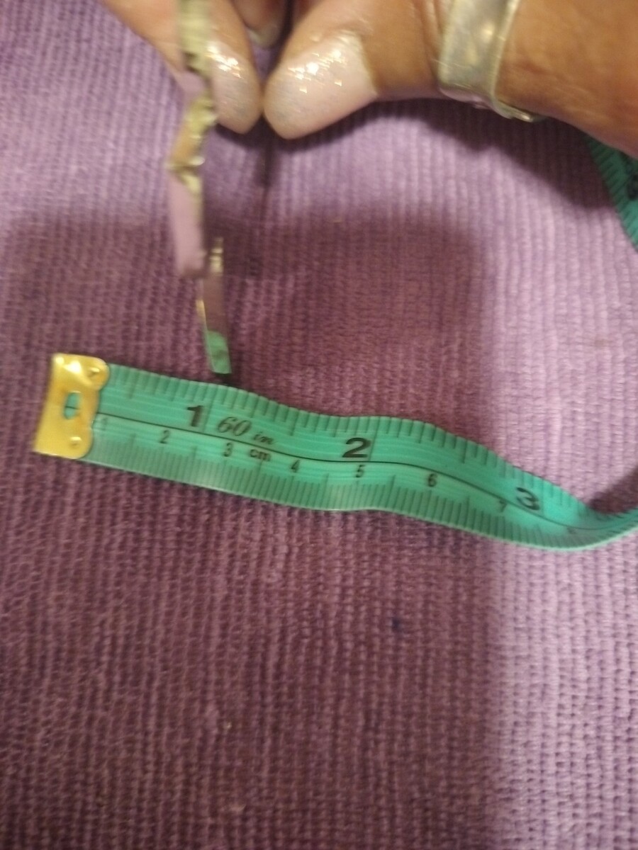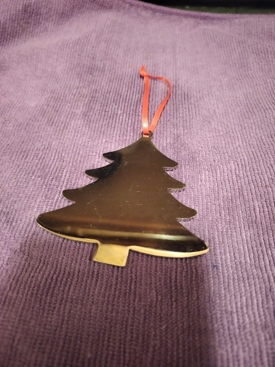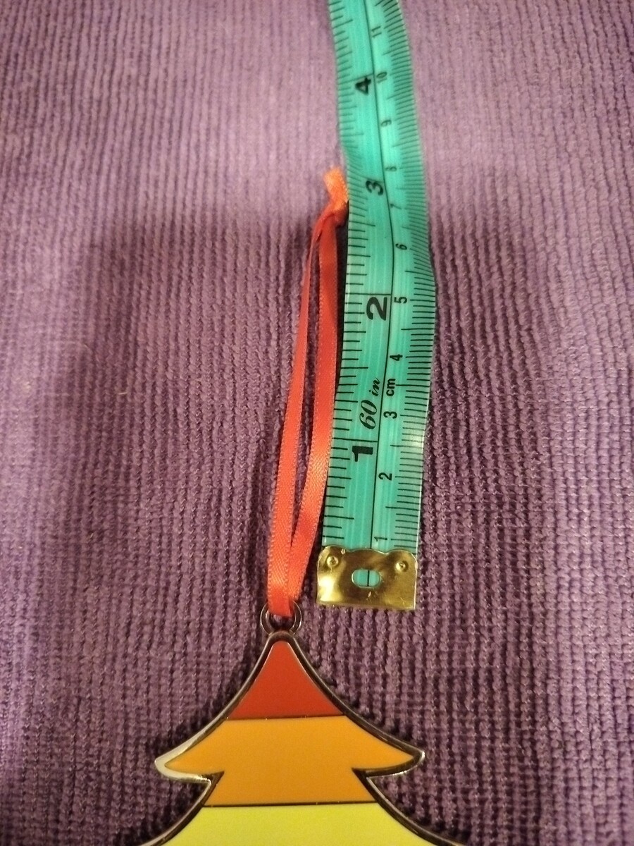 It is new, but it was never in a box so there are some slight scratches on it but they are barely visible - not even in the pictures. It is approximately 3.25 inches wide at the base at its widest point and 3 inches tall (not including the hanging ribbon). Please see the photos as there are pictures of it up against a tape measure.