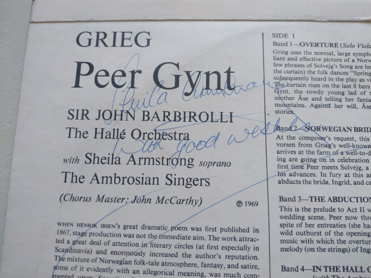 Grieg Gynt Barbirolli - LP 12 " vinyl VG/VG Signed By Sheila Armstrong