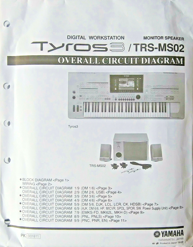 Original Yamaha Tyros3 Digital Workstation Overall Circuit Diagram / Schematics Sheets, in their cover. Also covers the TRS-MS02 Monitor Speakers