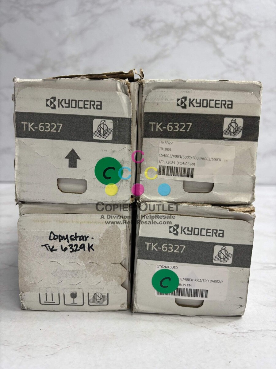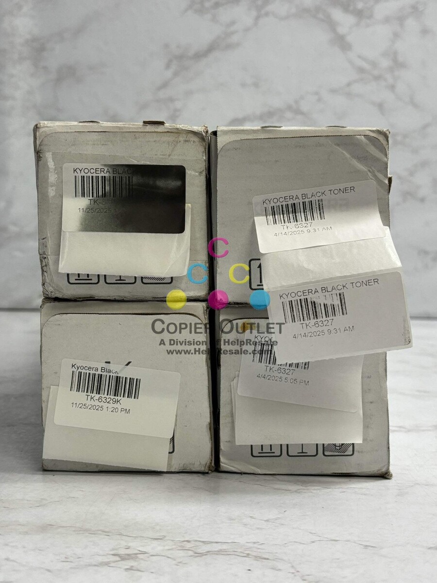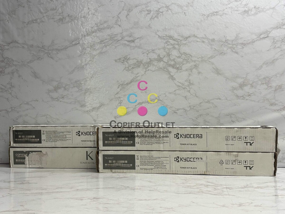 Lot Of 4 New Genuine Kyocera TK-6327, TK-6329 Black Toners Black TK-6327 1T02NK0US0 x 3 Black TK-6329 1T02NK0CS0 x1 New Same Day Shipping For TASKalfa 4002i,4003i,5002i,5003i,6002i,6003iCopystar CS4002i,CS4003i,CS5002i,CS5003i,CS6002i,CS6003i Listed by: Renee (Sales Team) ?The quality of our life on planet earth depends on the choices we make every day.? ~BJ Fogg (A positive moment brought to you by Help Resale) Copier Outlet (A Division of Help Resale) Copier Outlet was established in 1993. We buy and sell both domestically and internationally and have wide assortment of copiers, consumable and accessories of all popular brands. All of our copiers are in house and available for your inspection. They all have been tested and rated for functions, cosmetics and overall appearance. Our consumable and accessories selections include toners, imaging units, developers and copier parts such as fax board, fixing unit, fuser unit, roller, cleaning brush, drum blades and etc. For more detailed information on our copiers, consumables and accessories, please feel free to give us a call. We are more than happy to assist you with the pricing and guide you to find the copiers, consumable and accessories you wish to buy. Best Regards, Copier Outlet Sales Team Monday - Friday: 9:00 am to 5:00 pm (PST) Copier Outlet Promo Video - YouTube Video will open in a new windowUsing the App? Paste link into a browser window: [isdntekvideo] All product and company names are trademarks TM or registered trademarks of their respective holders. Use of them does not imply any affiliation with or endorsement by them.
