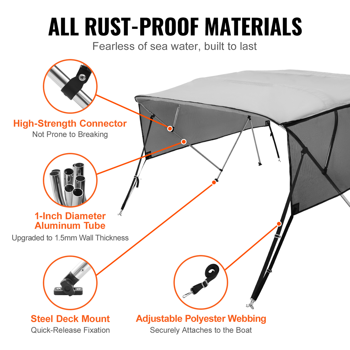 VEVOR 4 Bow Bimini Top Boat Cover, 600D, 8'L x 54"H x 91"-96"W, Light Grey