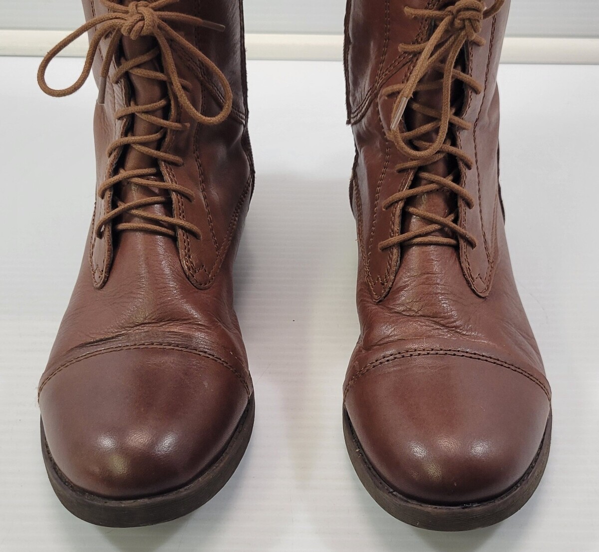 Boots are in overall good, used condition but the inside zipper flap had flaking from being zipped up and down. Exterior of boots is in good condition and flaking is isolated to the inner flap.