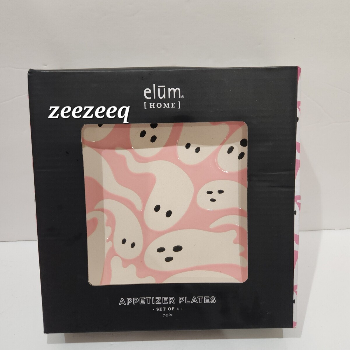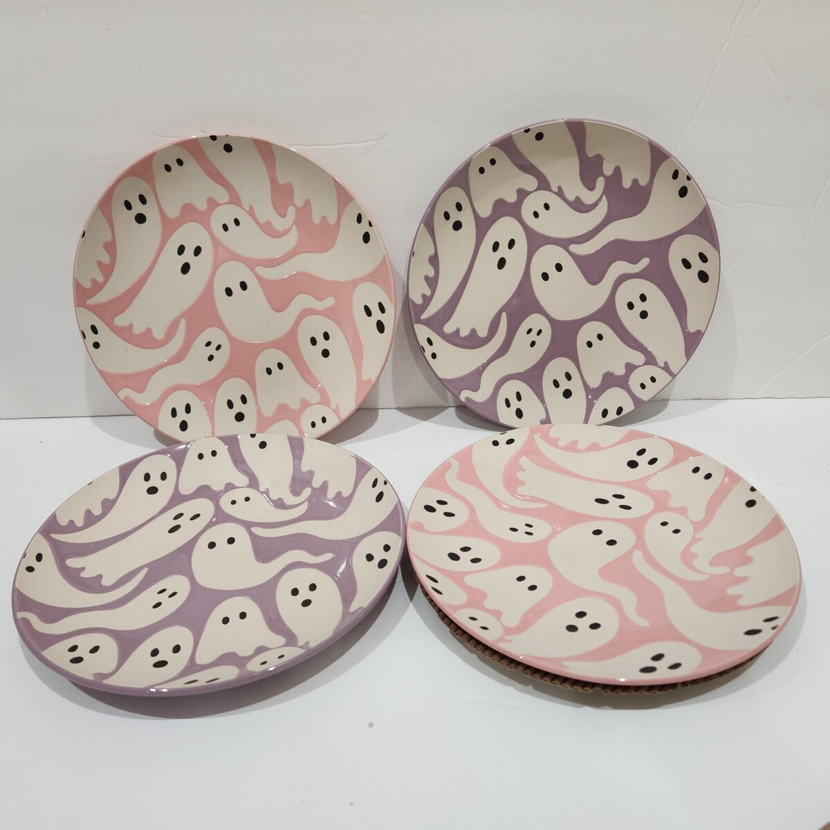 Up for sale we have these adorable ghost appetizer plates by Elum Home. There are 2 pink and 2 lavender plates. Made of ceramic and measure approx 7.5" in diameter. These will not come with box shown to be able to wrap each plate individually. New