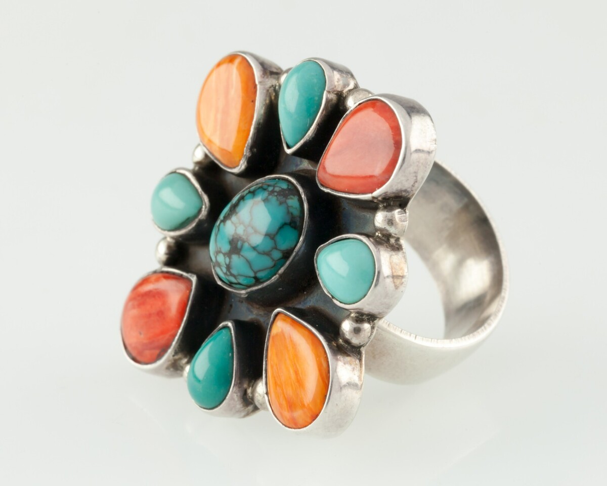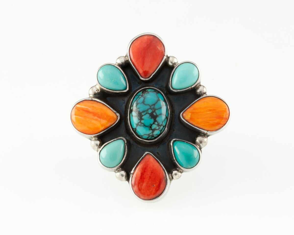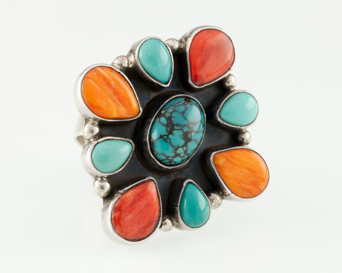 Gorgeous Sterling Silver Cluster Ring with a mix of Turquoise and Orange Spiney.