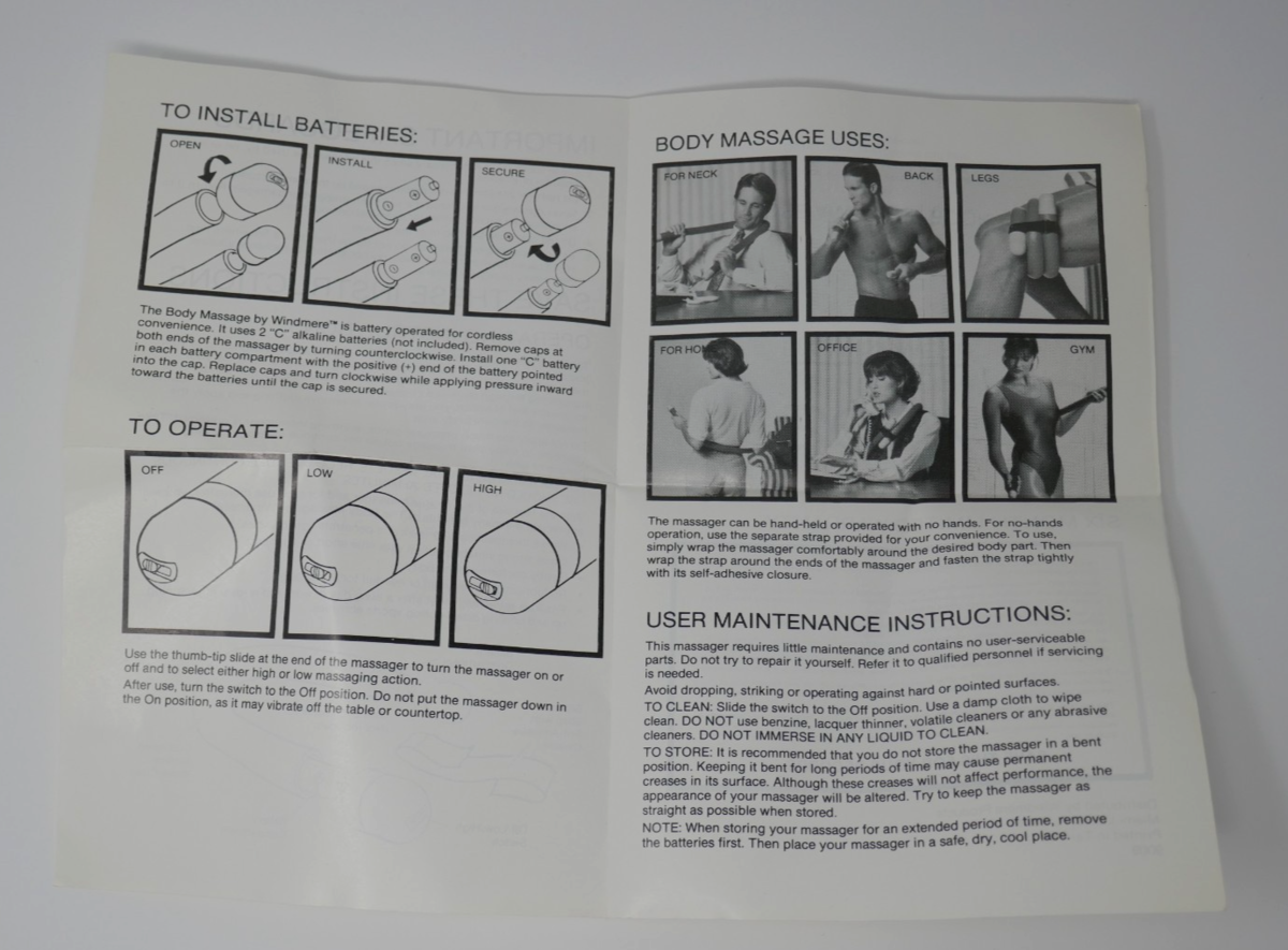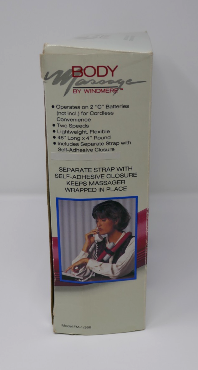 Up for sale is a vintage Body Massage by Windmere pulsating massager. This requires 2 "C" batteries, which is not included. The box shows minor shelf wear consistent with its age.