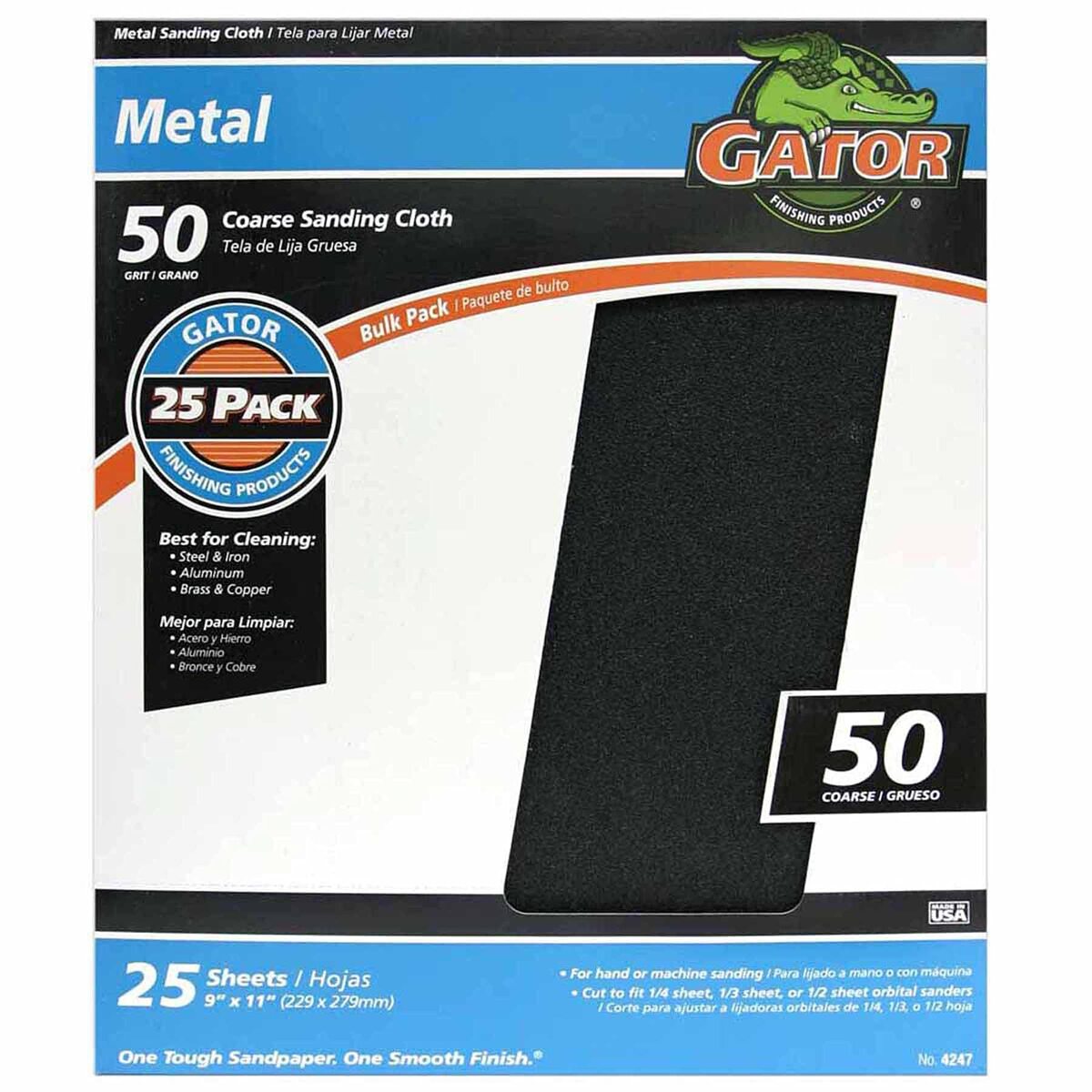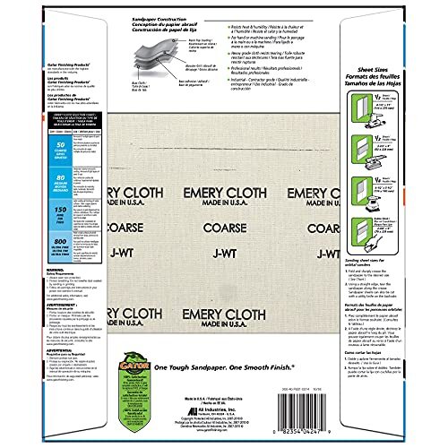 Product description: The Gator 9" x 11" Emery Cloth Sanding Sheets, model 4247, are perfect for all your sanding needs. These coarse 50-grit sheets, manufactured by ALI Industries, are designed for use with metal, wood, plastic, and fiberglass materials. The 25-count package offers convenience and value, and the cloth backing ensures durability and ease of use. With accurate dimensions of 11.25 inches in length and 9 inches in width, these sanding sheets are a versatile and practical choice for a variety of sanding devices. The package measurements are 11.25 inches in length, 9.25 inches in width, and 0.75 inches in height, making for easy and compact storage. Experience the high-quality performance and long-lasting durability of the Gator brand with these sanding sheets.