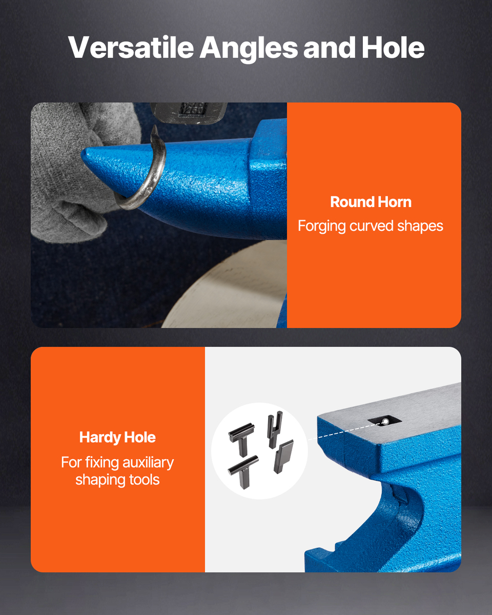 Hole Horn for Different Uses: The round horn of the blacksmith anvil can be used for flatting, bending, and shaping. And the hardy hole shows a good performance in accessories’ punching and twisting.