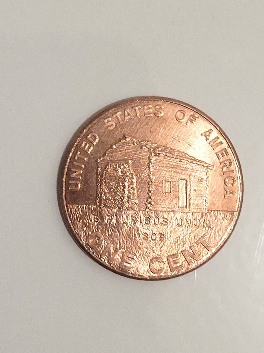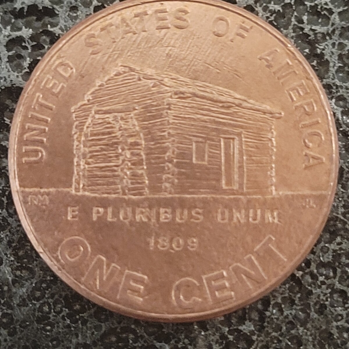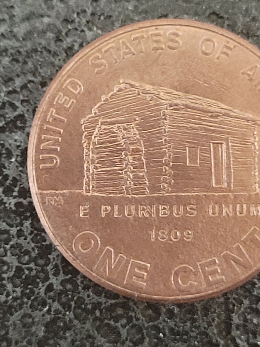The back of the coin, designed to represent Lincoln's early life in Kentucky, features a log cabin.