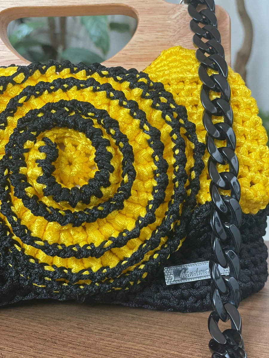 Hand-knitted ?, with a wooden handle and a statement design in yellow and black, this bag is the ultimate expression of style and confidence.
