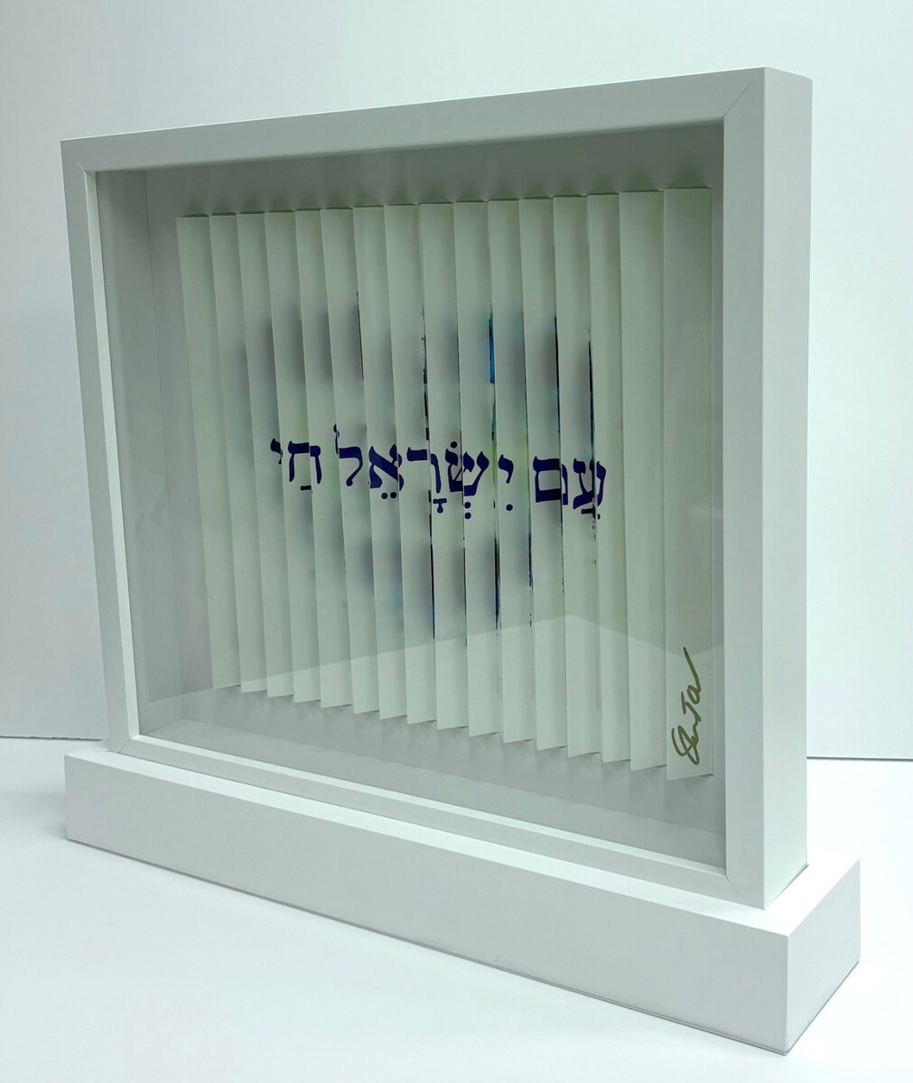 This captivating artwork, titled "Am Yisrael Chai," by the famed artist Shem Tov, features a striking depiction of the Israeli flag, elegantly shaped in deep shades of blue. The design evokes a profound sense of love and patriotism for the land of Israel